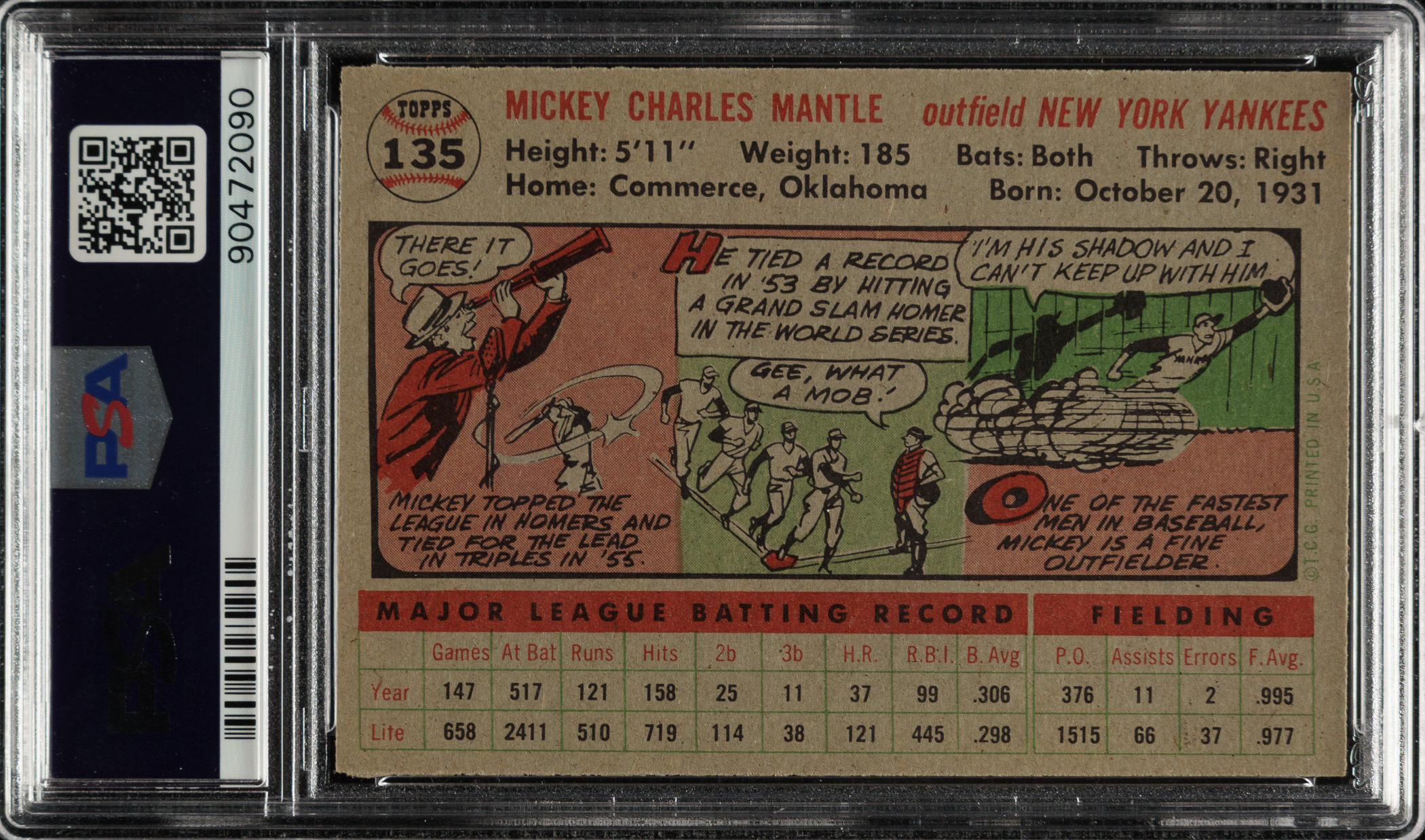 Graded MINT 9 by PSA. Magnificent ultra high-grade example of the gray-back variety of this classic Mickey Mantle card. In addition to being a striking card with an exceptional design, this card dates from Mantle's Triple Crown season. Many consider this to be the quintessential Mantle card. Crisp and clean with bold colors, strong corners, and impressive centering. Clean reverse. This is the key card in the set and one of the cornerstones to a high-grade 1950s Mantle card collection or a classic 1950s card collection.