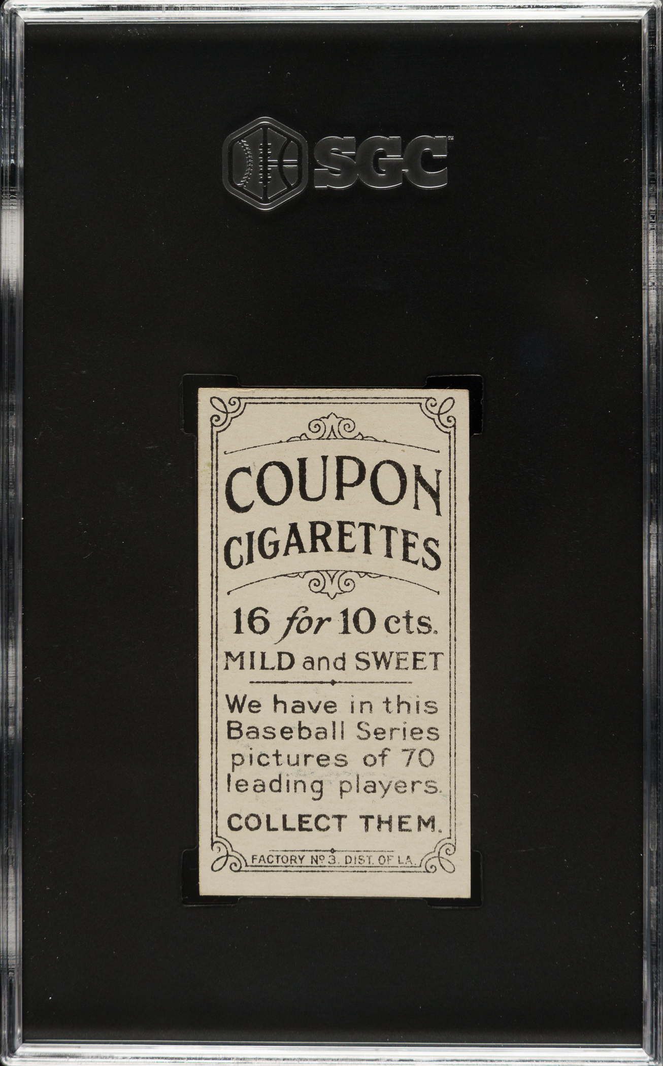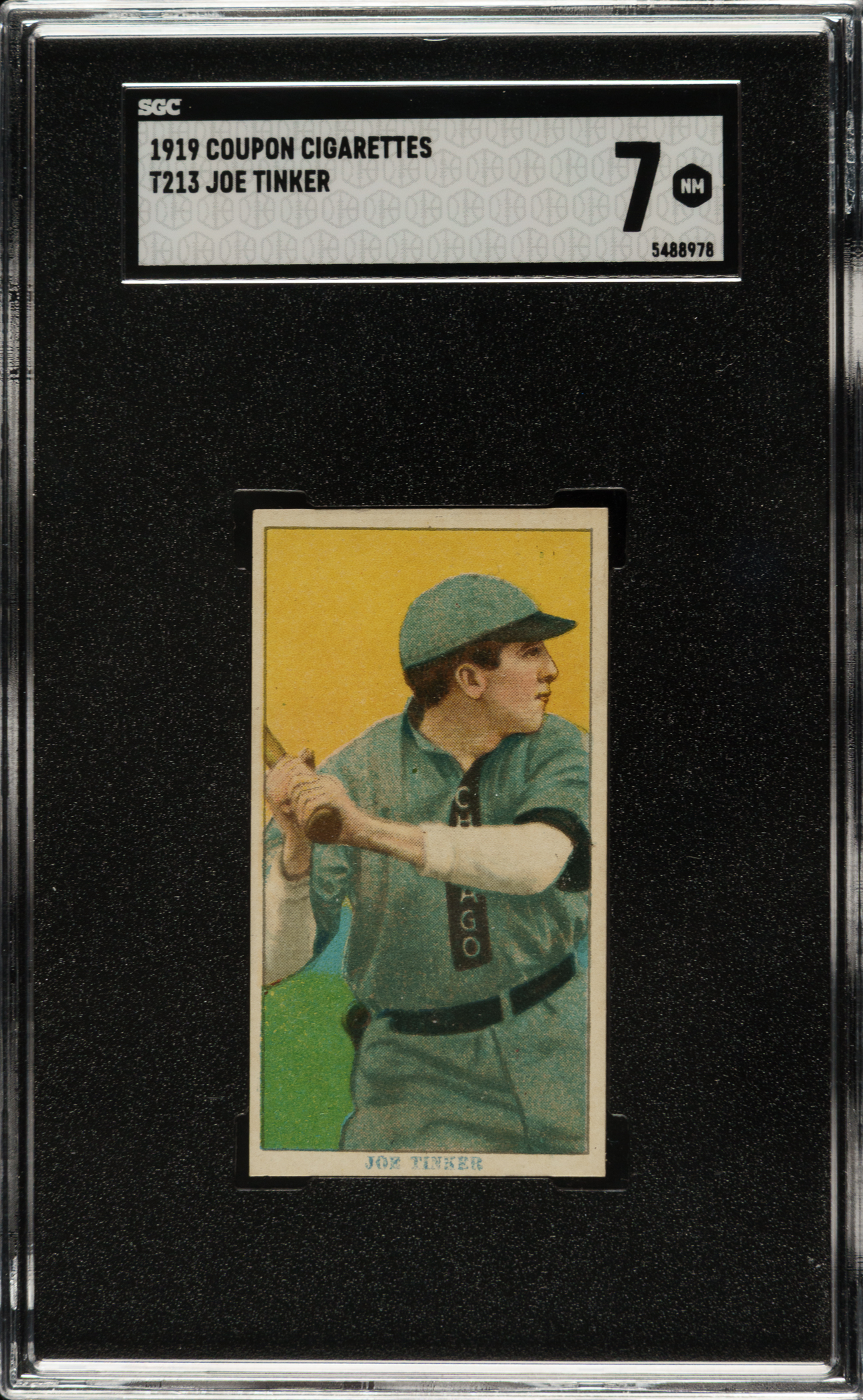 Graded NM 7 by SGC. This is the ONLY example graded at this level by SGC with none higher! High-grade T213 (Type 3) of Chicago Cubs Hall of Famer Joe Tinker from this elusive and extremely rare tobacco set. T213 (Type 3) Coupon Cigarettes are one of the most unusual and overlooked of all tobacco-card issues. Issued in 1919, it is the last of the traditional tobacco-card sets. Similar in design and borrowing images from the T206 set, T213-3 Coupon cards are thought to have been issued exclusively in the Louisiana area. The offered card has bright colors, a crisp image, and light corner wear. Clean reverse with bold print. T213 (Type 3) Coupons are one of tobacco-card collecting's most overlooked issues. This is a tremendous high-grade example of a significant and particularly rare Joe Tinker card.