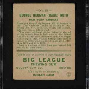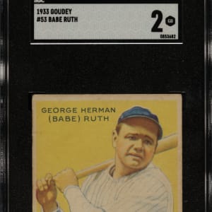 Graded GOOD 2 by SGC. Modestly graded example of one of New York Yankees Hall of Famer Babe Ruth’s classic cards: #53 (yellow background) from the 1933 Goudey series. The "yellow background" pose of Babe Ruth is without a doubt his most difficult to obtain and the most sought-after card in the 1933 Goudey set. This is an excellent opportunity to acquire one of Ruth's classic cards from the popular 1933 Goudey Gum series and one of card collecting's iconic cards at a fraction of the cost of a higher-graded example.