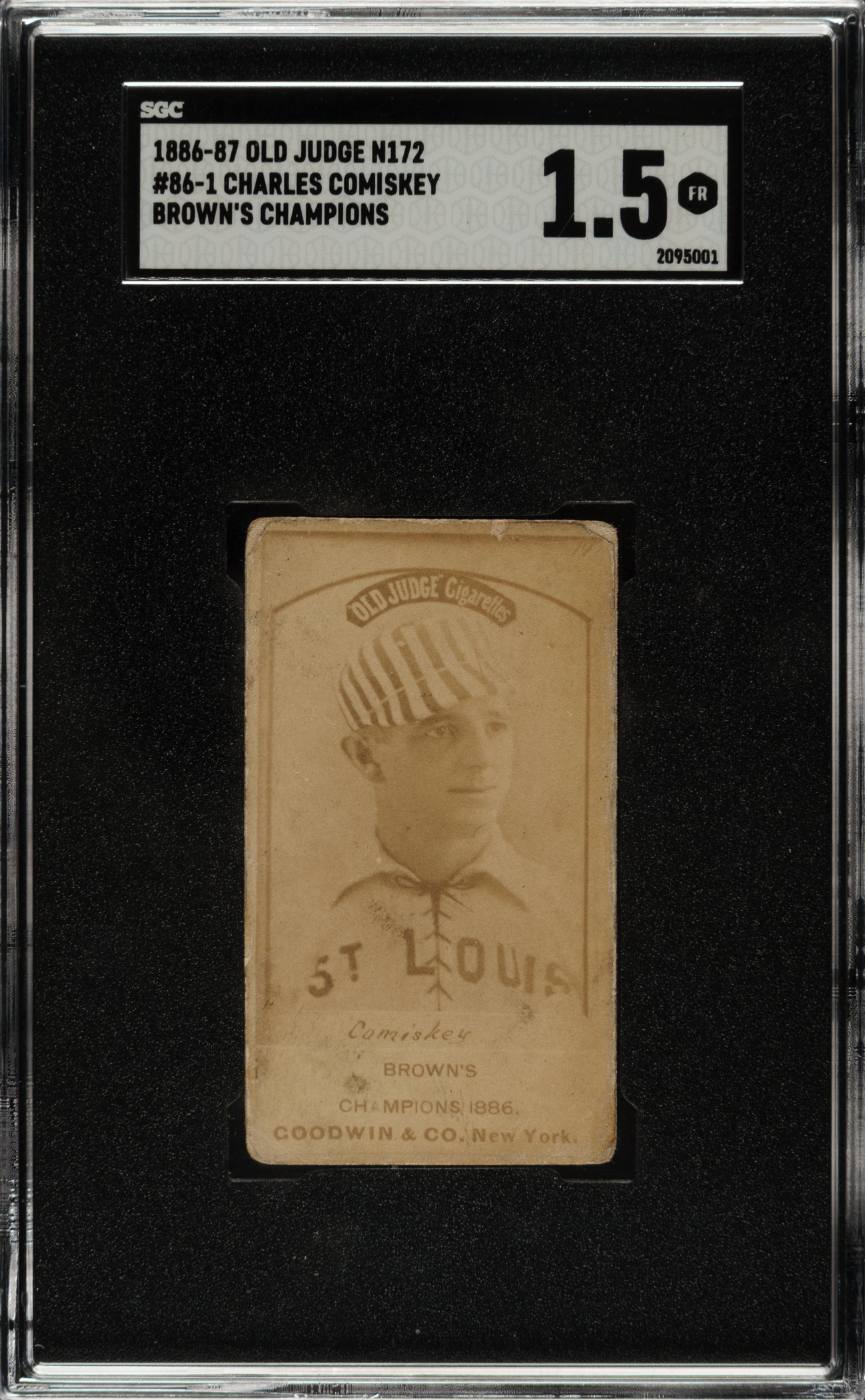 Graded FAIR 1.5 by SGC. Rarely offered example of St. Louis Browns Hall of Famer Charles Comiskey, the key card from the classic 1887 Brownie Champs set, which features portraits of the stars from this legendary championship team. Comiskey is the only Hall of Famer in this highly sought after Old Judge subset. The offered example displays rounded corners and light soiling front and back. The Brownie Champs set has always been among the most distinctive and popular of all Old Judges, and Comiskey is unquestionably the key card in the series.
