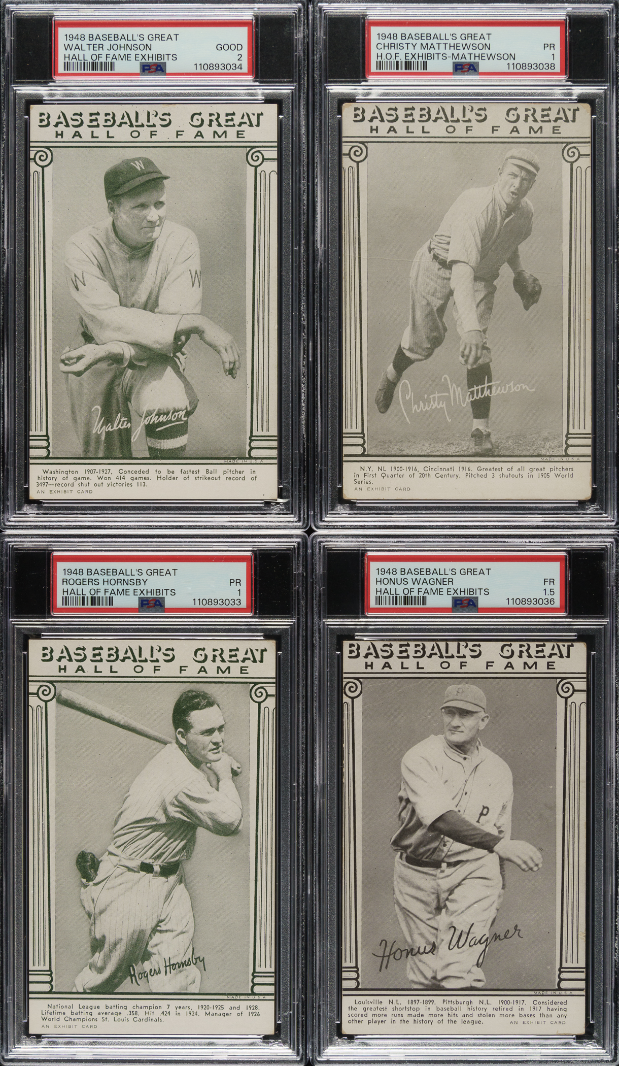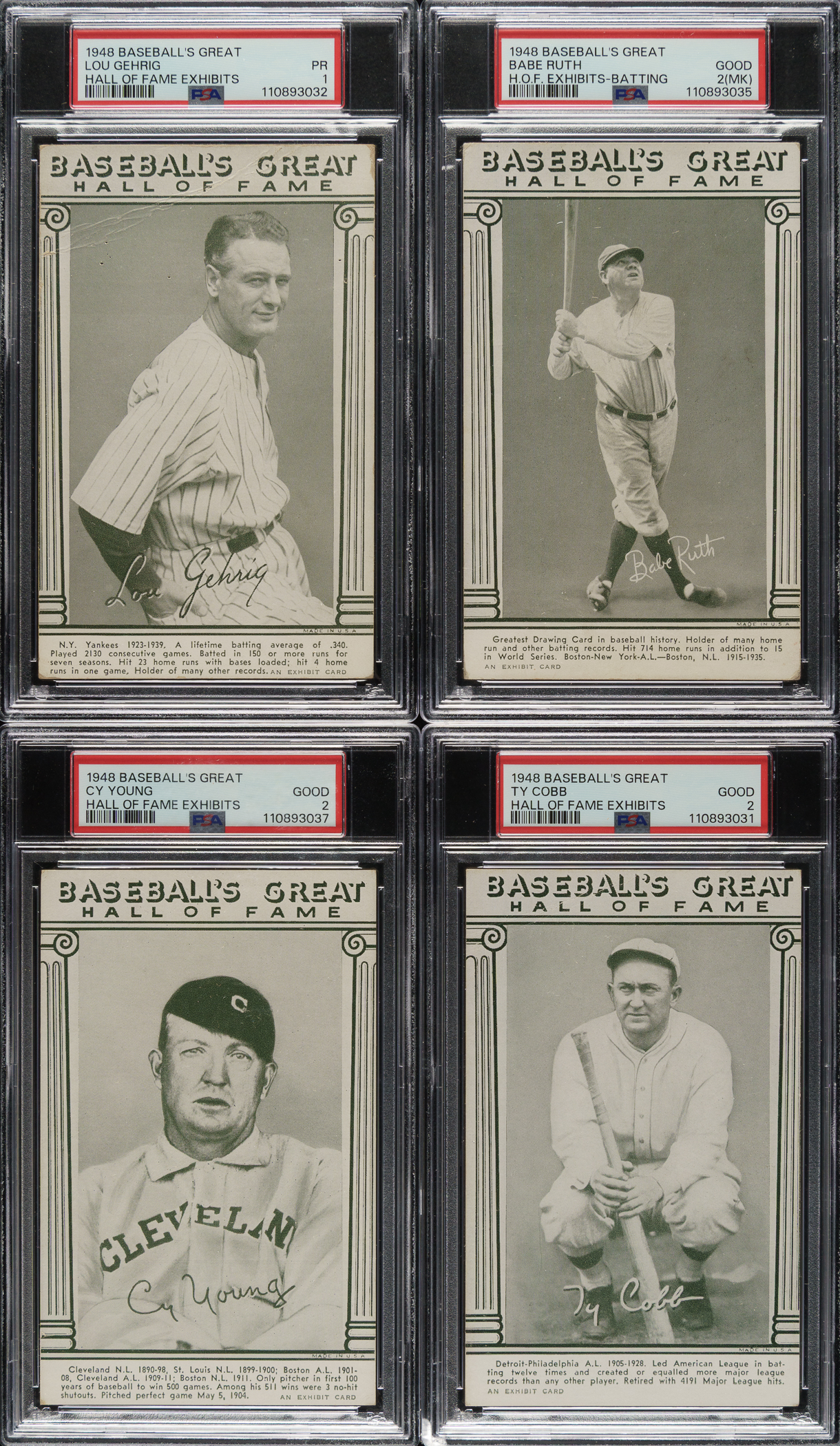 Very attractive near-complete set of 27 different 1948 Hall of Fame Exhibits (out of 33 in the set). Missing the following six exhibits for completion: Alexander, Cochrane, Collins, Ruth/standing with bats, Sisler, and Walsh. These unnumbered black-and-white (in some cases green-tint) Exhibit cards feature all-time great Hall of Famers, and no doubt instilled a great appreciation of baseball history in youngsters of the day. This collection consists of 18 green-tint versions and nine black-and-white. The 1948 Hall of Fame Exhibit cards were issued on cardboard stock and each card has the player's brief biography printed along the bottom. The set is naturally highlighted by many of the great legends of the game, including Ty Cobb, Lou Gehrig, Rogers Hornsby, Walter Johnson, Babe Ruth (two different poses, with the batting pose included here), Tris Speaker, Honus Wagner, and Cy Young. Twenty-four cards from this set were reproduced in 1974 and the reproductions (which are printed in various colors) sometimes cause confusion. Condition is 37% Vg-Ex to Ex (including one Ex-Mt), 37% Gd to Vg, and 26% lesser. Eight cards have been professionally graded and encapsulated by PSA. Keys: Cobb (GOOD 2), Gehrig (POOR 1), Hornsby (POOR 1), Johnson (GOOD 2), Mathewson (POOR 1), Ruth/batting (GOOD 2 [MK]), Wagner (FAIR 1.5), and Young (GOOD 2). This is a very presentable medium- to lower-grade near-complete set of this classic and often overlooked Exhibit Supply Company issue. Total: 27 cards.