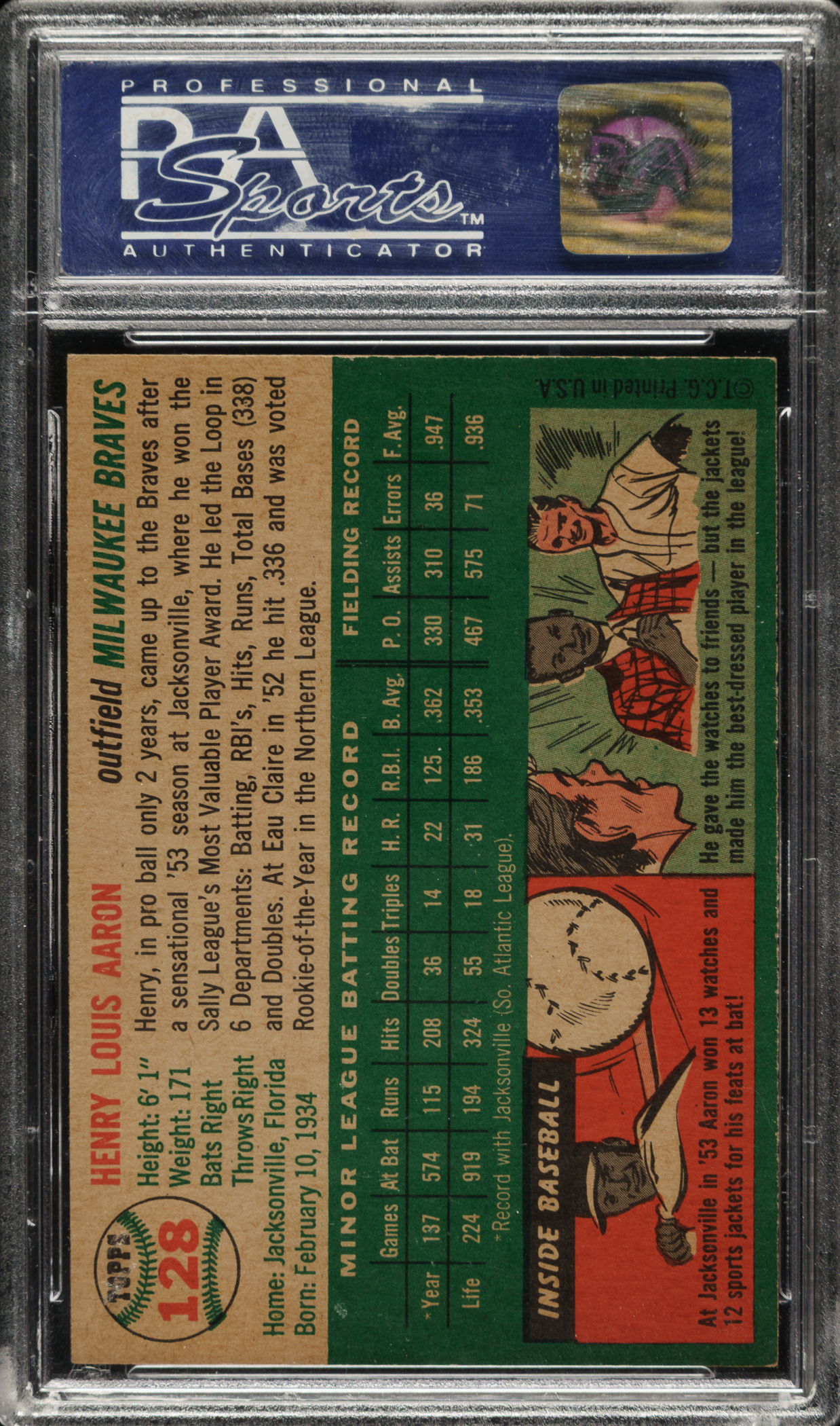 Graded NM-MT 8 by PSA. Outstanding high-grade example of Milwaukee Braves Hall of Famer Hank Aaron's rookie card. One of card collecting's classics, Aaron's rookie card is the key to the 1954 Topps set and one of the most popular of all postwar baseball cards. The card has vibrant colors, a crisp image, and strong corners. Boldly printed reverse. This is a fantastic high-grade example of Hank Aaron’s rookie card, one of the most important of all classic 1950s cards.