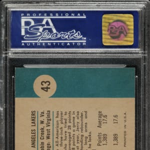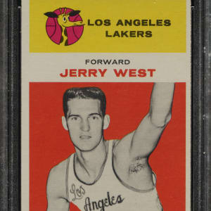 Graded NM-MT 8 by PSA. Extremely attractive high-grade example of Los Angeles Lakers Hall of Famer Jerry West’s rookie card from the classic 1961-1962 Fleer basketball set. This card features bright colors, a crisp image, and strong corners. Boldly printed reverse. This is a beautiful example from one of the most significant basketball sets ever produced and would make a worthy addition to a high-grade 1961-1962 Fleer set or Hall of Fame rookie-card collection.