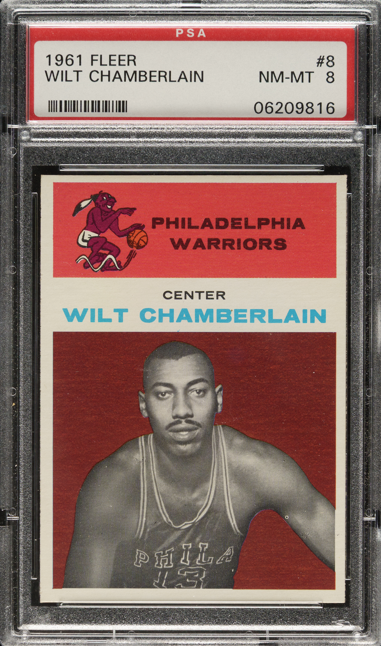 Graded NM-MT 8 by PSA. Outstanding high-grade rookie card of Hall of Famer Wilt Chamberlain from the 1961-1962 Fleer basketball set. Chamberlain's rookie card is recognized as one of the classics of all basketball cards. Besides being Chamberlain's most popular card, this is the key to the set. This example has a deep red background, a crisp image of Chamberlain, and strong corners. Boldly printed reverse. This is an exceptional example of Wilt Chamberlain's rookie card from one of the most significant basketball sets ever produced.