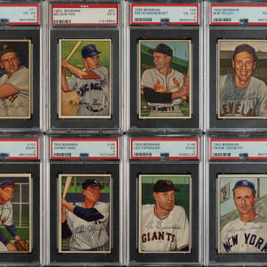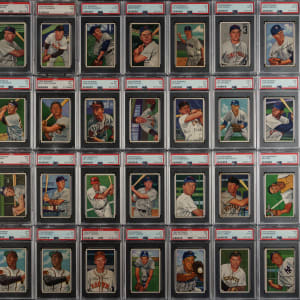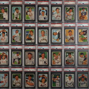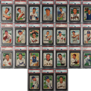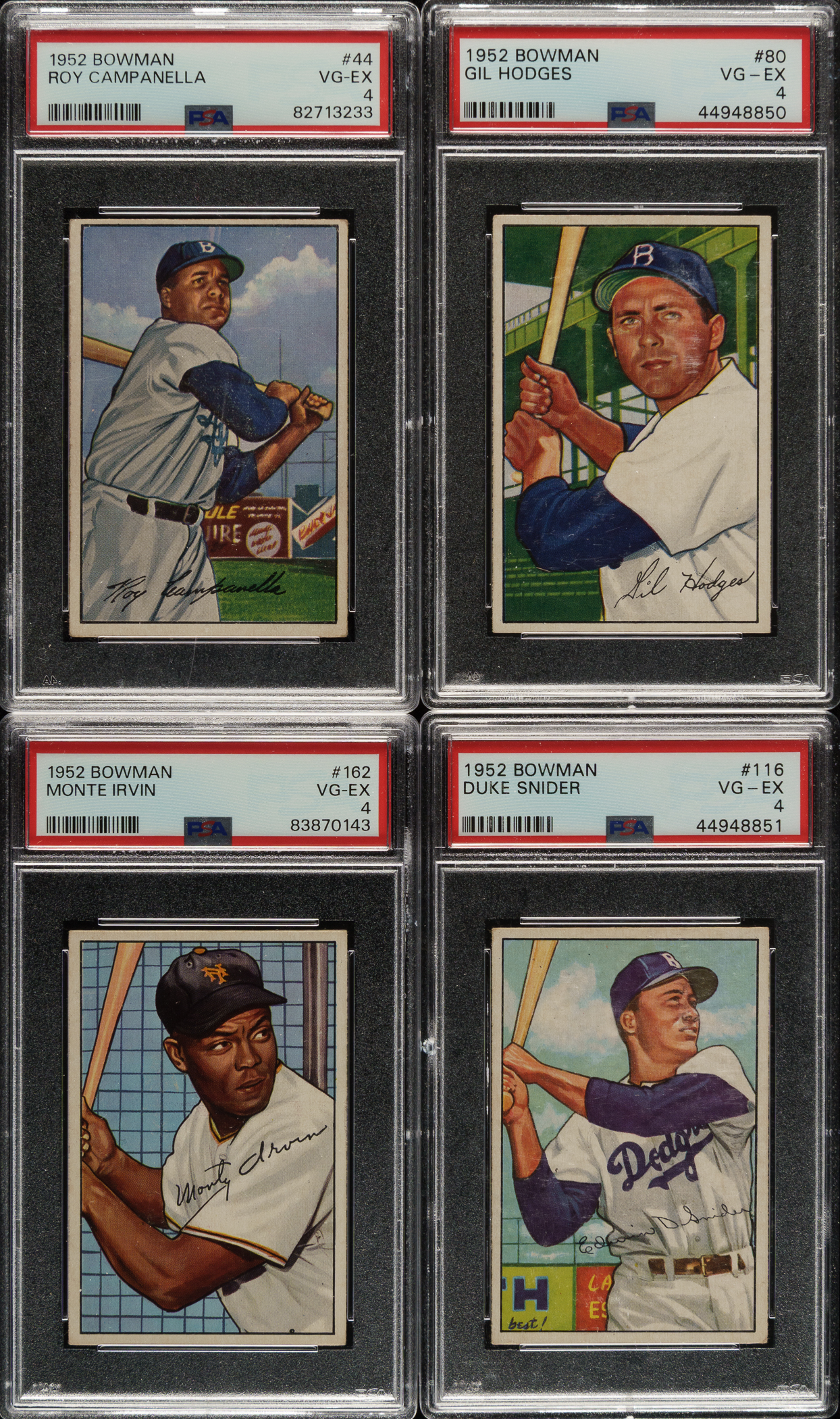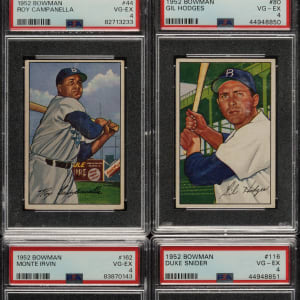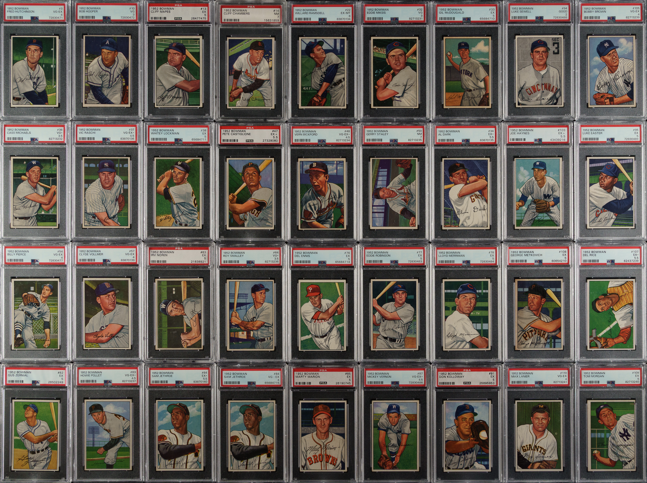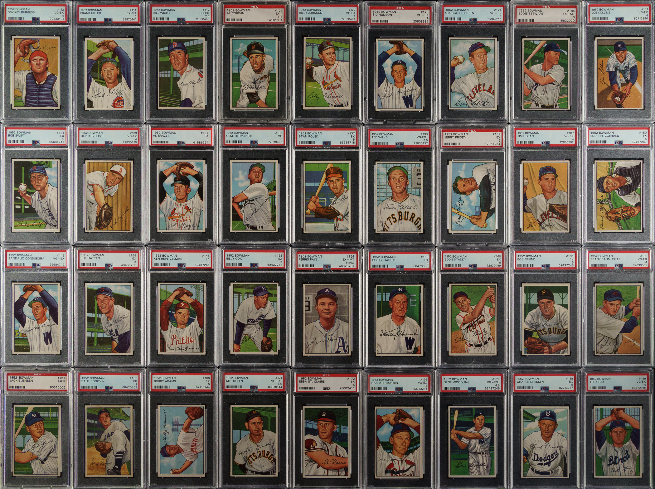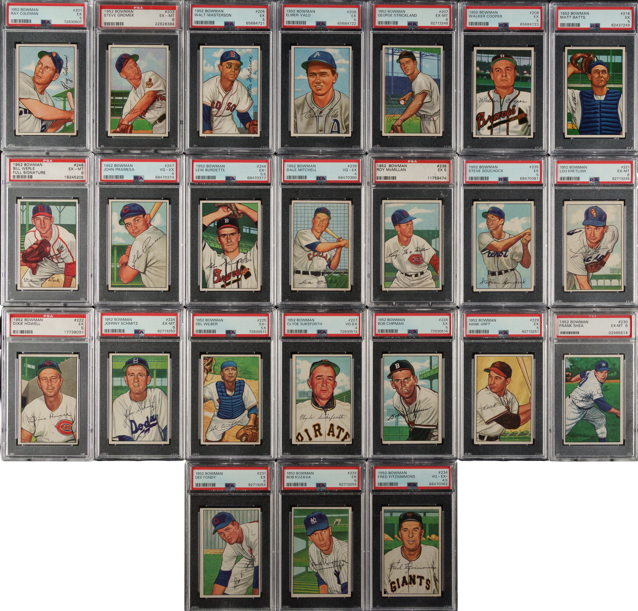 Sizeable collection of 109 different cards (plus one duplicate #84) from the 1952 Bowman baseball series. This collection is highlighted by several Hall of Famers and stars, including Roy Campanella, Bob Feller, Duke Snider, and Gil Hodges. Each card is professionally graded and encapsulated by PSA. This collection represents 43% of the set. PSA Grading Composite: NM 7 (2 cards): #14 and 50. EX-MT 6 (10 cards): #22, 114, 154 (MK), 185, 203, 207, 221, 224, 230, and 248. EX+ 5.5 (8 cards): #34, 47, 84, 103, 107, 121, 225, and 244. EX 5 (43 cards): #13, 21 Fox, 33, 38, 63, 76, 77, 78, 82, 85, 91, 95, 108, 109, 131, 134, 137, 139, 144, 145 Mize, 148, 152, 158, 160, 161, 166, 172, 180, 188, 191, 201, 205, 206, 208, 216, 222, 228, 229, 231, 233, 235, 238, and 242 Crosetti. VG-EX+ 4.5 (8 cards): #37, 48, 83, 87, 138, 171, 177, and 234. VG-EX 4 (29 cards): #3, 4 Roberts, 11 Kiner, 30 Schoendienst, 43 Feller, 44 Campanella, 54, 57, 80 Hodges, 84, 105, 110, 112, 115 Doby, 116 Snider, 122, 123, 124, 133, 143, 162 Irvin, 176, 181, 187, 195, 199, 227, 239, and 247. VG+ 3.5 (2 cards): #36 and 64. VG 3 (3 cards): #10, 32, and 136. GOOD+ 2.5 (1 card): #117. GOOD 2 (3 cards): #94, 142 Wynn, and 146 Durocher. POOR 1 (1 card): #165. Total: 110 cards. The size/weight of this item requires that there will be an additional shipping charge for this lot.