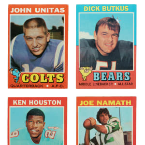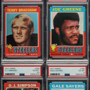 Presented is a complete set of 1971 Topps football consisting of 263 different cards. The colored flush-to-the-border design of the 1971 Topps football set makes this issue particularly challenging to collect in extremely high grade. This classic set features all the stars of the era, including rookie cards of Hall of Famers Terry Bradshaw, Joe Greene, Ken Houston, and Willie Lanier, and stars such as Johnny Unitas, Dick Butkus, Bart Starr, Fran Tarkenton, Gayle Sayers, and Joe Namath. Condition is 16% Nr/Mt or slightly better, 77% Ex to Ex-Mt, and 7% slightly lesser. We have selected four cards to be professionally graded and encapsulated by PSA. Keys: #1 Unitas (Vg-Ex+), 25 Butkus (Ex), 27 Checklist (Vg+), 106 Checklist (Ex), 113 Houston RC (Ex), 114 Lanier RC (Ex), 120 Tarkenton (Ex), 150 Sayers (EX-MT 6), 156 Bradshaw RC (VG-EX 4), 188 Wehrli RC (Ex-Mt+), 200 Starr (Vg-Ex), 210 Sanders RC (Ex+), 245 Greene RC (EX 5), 250 Namath (Ex-Mt), and 260 Simpson (VG-EX+ 4.5). A very attractive complete set of this popular 1970s Topps football issue. Total: 263 cards.