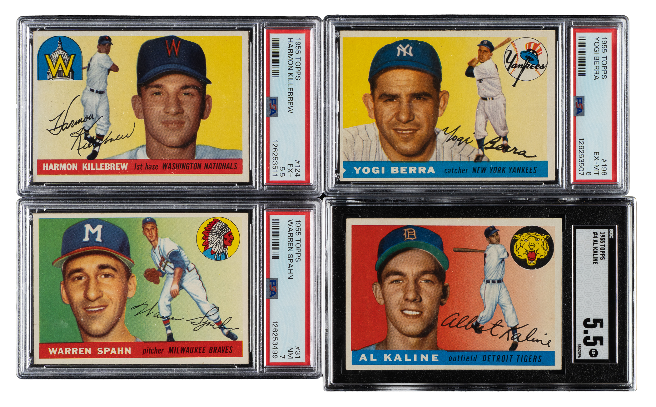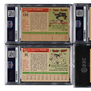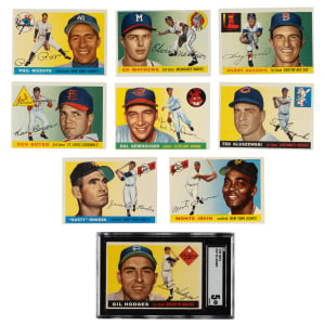 This is a very attractive medium- to high-grade near-complete set (193 out of 206) of the classic 1955 Topps issue, highlighted by the rookie card of Harmon Killebrew. Missing the following 13 cards for completion: #2 Williams, 28 Banks, 47 Aaron, 50 Robinson, 98, 119, 123 Koufax, 141, 164 Clemente, 191, 194 Mays, 197, and 210 Snider. Condition is 22% Nr/Mt or better, 52% Ex to Ex-Mt, and 26% Vg to Vg-Ex (including some due solely to centering). Six cards have been professionally graded and encapsulated by PSA. Keys: #1 Rhodes (90/10 T/B, otherwise Ex-Mt), 4 Kaline (EX+ 5.5), 24 Newhouser (95/5 T/B, otherwise Ex+), 31 Spahn (NM 7), 100 Irvin (Ex), 120 Kluszewski (Ex), 124 Killebrew RC (EX+ 5.5), 125 Boyer RC (95/5 T/B, otherwise Ex-Mt), 152 Agganis RC (98/2 T/B, otherwise Ex-Mt), 155 Mathews (Ex), 187 Hodges (EX 5), 189 Rizzuto (Ex due to centering), and 198 Berra (EX-MT 6). Additional PSA-graded card: #136 Stewart (NM 7). This is an exceptionally attractive mid- to high-grade near-complete set of 1955 Topps, one of the most classic 1950s Topps series. Total: 193 cards.
