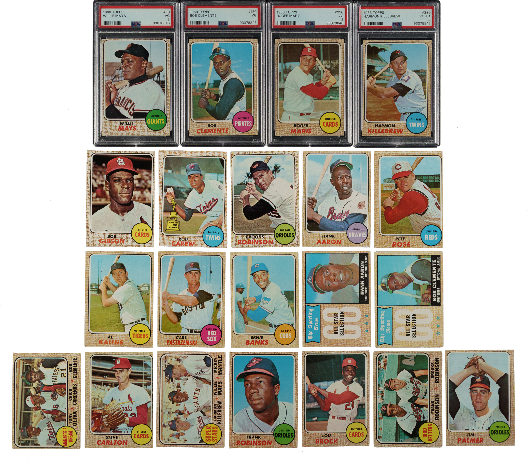 Presented is a complete set of 1968 Topps, highlighted by the rookie cards of Hall of Famers Nolan Ryan and Johnny Bench. The 1968 Topps set also includes the extremely popular “combo” cards featuring more than one player with #480 Managers Dream (with Roberto Clemente), #490 Superstars (Harmon Killebrew, Mickey Mantle, and Willie Mays), and #530 Bird Belters (Frank and Brooks Robinson). Condition is 8% Ex-Mt (including a few Nr/Mt), 67% Vg-Ex to Ex, and 25% Gd to Vg (including 2% lesser, a couple that measure small, and a couple with a slight miscut). Six cards have been professionally graded and encapsulated by PSA. Keys: #20 B. Robinson (Vg), 45 Seaver (VG-EX 4), 50 Mays (VG 3), 80 Carew (tilted miscut, otherwise Vg), 100 Gibson (Vg+), 110 Aaron (Gd+), 150 Clemente (VG 3), 177 Ryan RC (Fr), 220 Killebrew (VG-EX 4), 230 Rose (90/10 L/R, otherwise Vg-Ex), 240 Kaline (Vg), 247 Bench RC (90/10 L/R, otherwise Vg+), 250 Yastrzemski (Pr), 280 Mantle (EX 5), 330 Maris (VG 3), 355 Banks (Gd), 370 Aaron AS (Vg-Ex), 374 Clemente AS (Fr), 408 Carlton (100/0 L/R, otherwise Ex), 480 Manager's Dream (Vg+), 490 Superstars (Vg), 500 F. Robinson (Vg-Ex), 520 Brock (Vg), 530 Bird Belters (Vg), and 575 Palmer (Ex). This is an attractive mid-grade complete set of one of the great 1960s Topps issues, loaded with Hall of Famers. Total: 598 cards.
