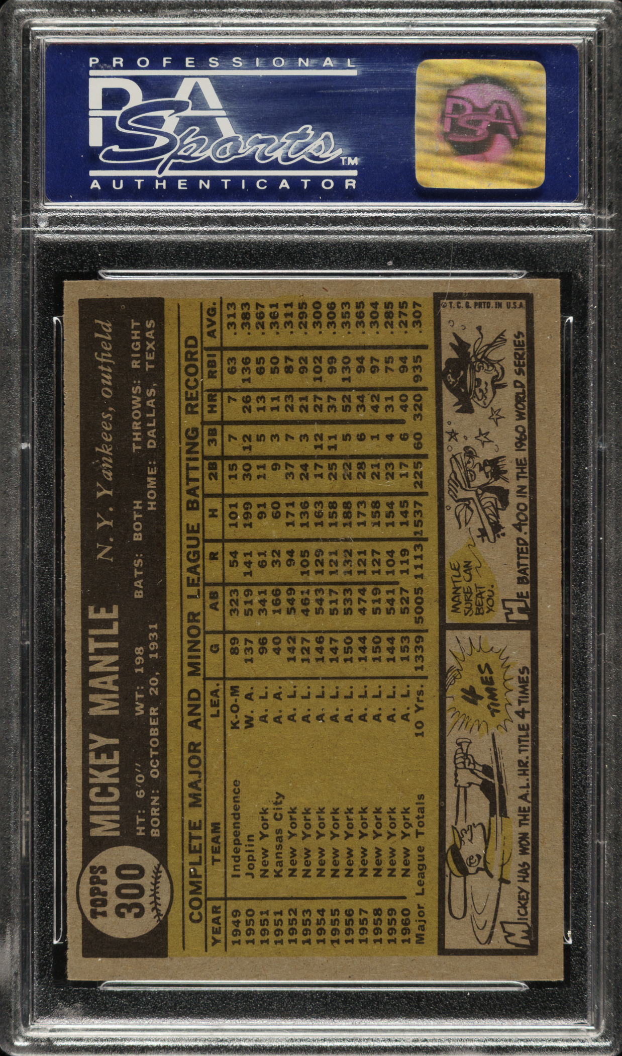 Graded NM-MT 8 by PSA. Beautiful high-grade example of 1961 Topps #300 Mickey Mantle, considered by many to be one of Mantle's great cards, dating from one of his biggest seasons. This example has vibrant colors, superb image clarity, and strong corners. Clean reverse. This is a fantastic example.