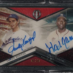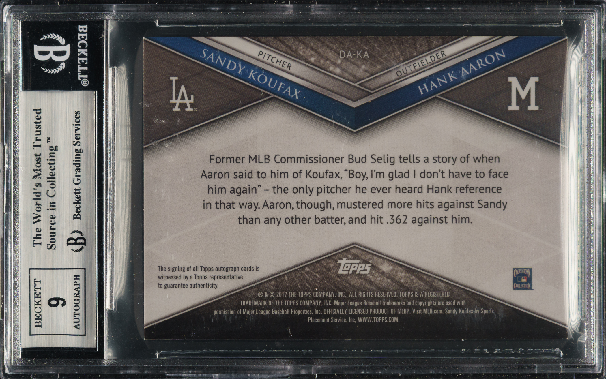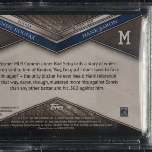 Graded MINT 9 with MINT 9 signature by BGS. Los Angeles Dodgers Hall of Famer Sandy Koufax and Milwaukee Braves Hall of Famer Hank Aaron.