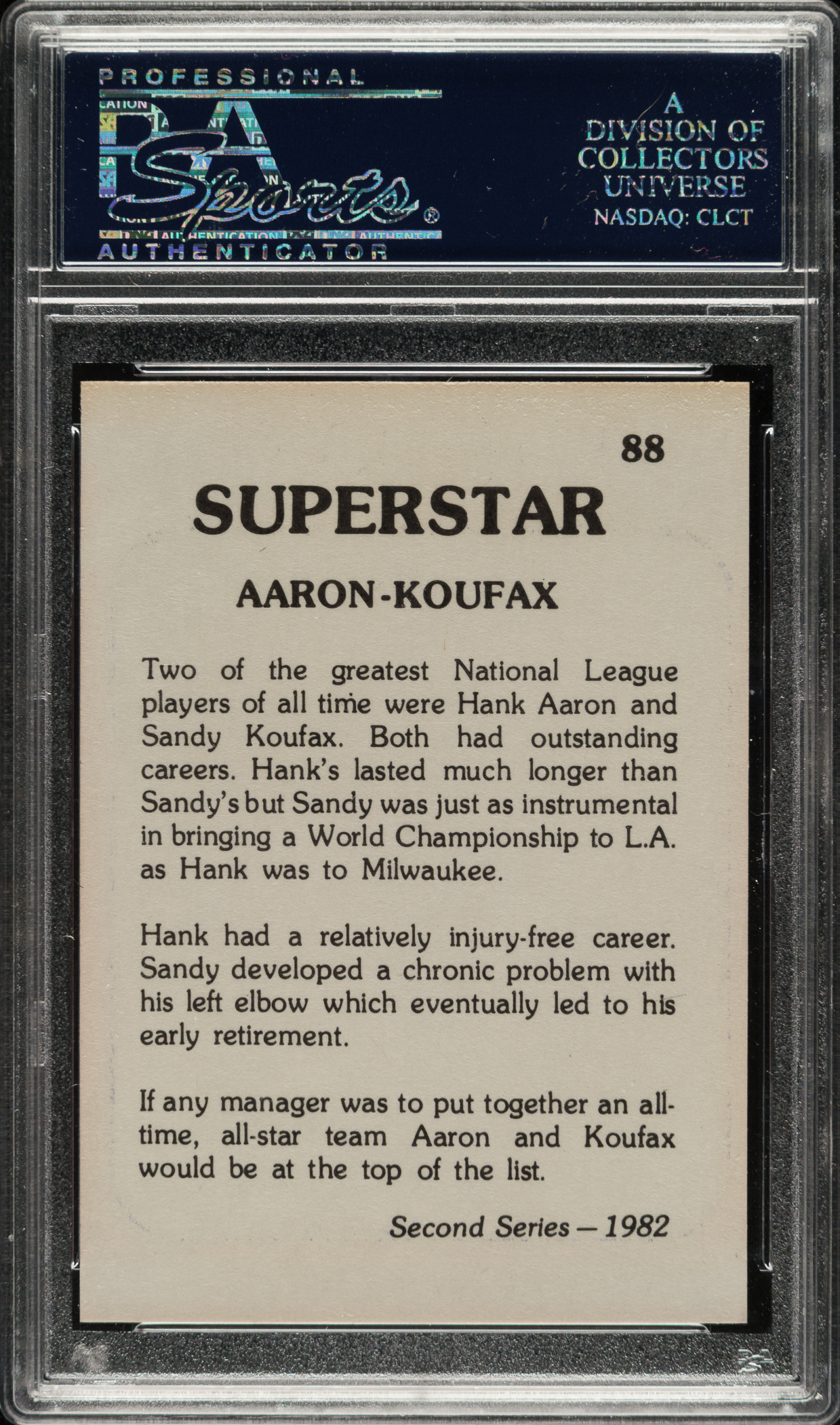 Presented is a Hank Aaron and Sandy Koufax signed 1982 Superstar #88 card. The card has been encapsulated, and the autographs deemed "Authentic," by PSA/DNA. Both signatures are boldly scripted across their images. The card is in Vg-Ex condition overall.