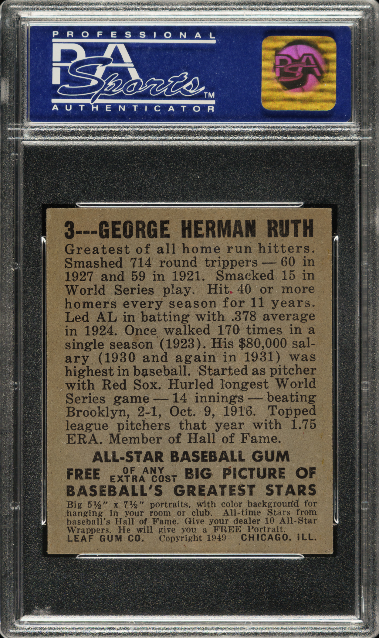 Graded NM 7 by PSA. High-grade example of this Babe Ruth classic. The 1948-1949 Leaf Bubble Gum card of Ruth is one of the most popular and striking of all his cards. It is on virtually every short list of the most classic and recognizable of all postwar baseball cards. The offered card has vibrant colors, a crisp image, strong corners, and light toning along the borders. The reverse is clean and free of staining and excess print. This is a fantastic example of one of the icons of postwar-card collecting.