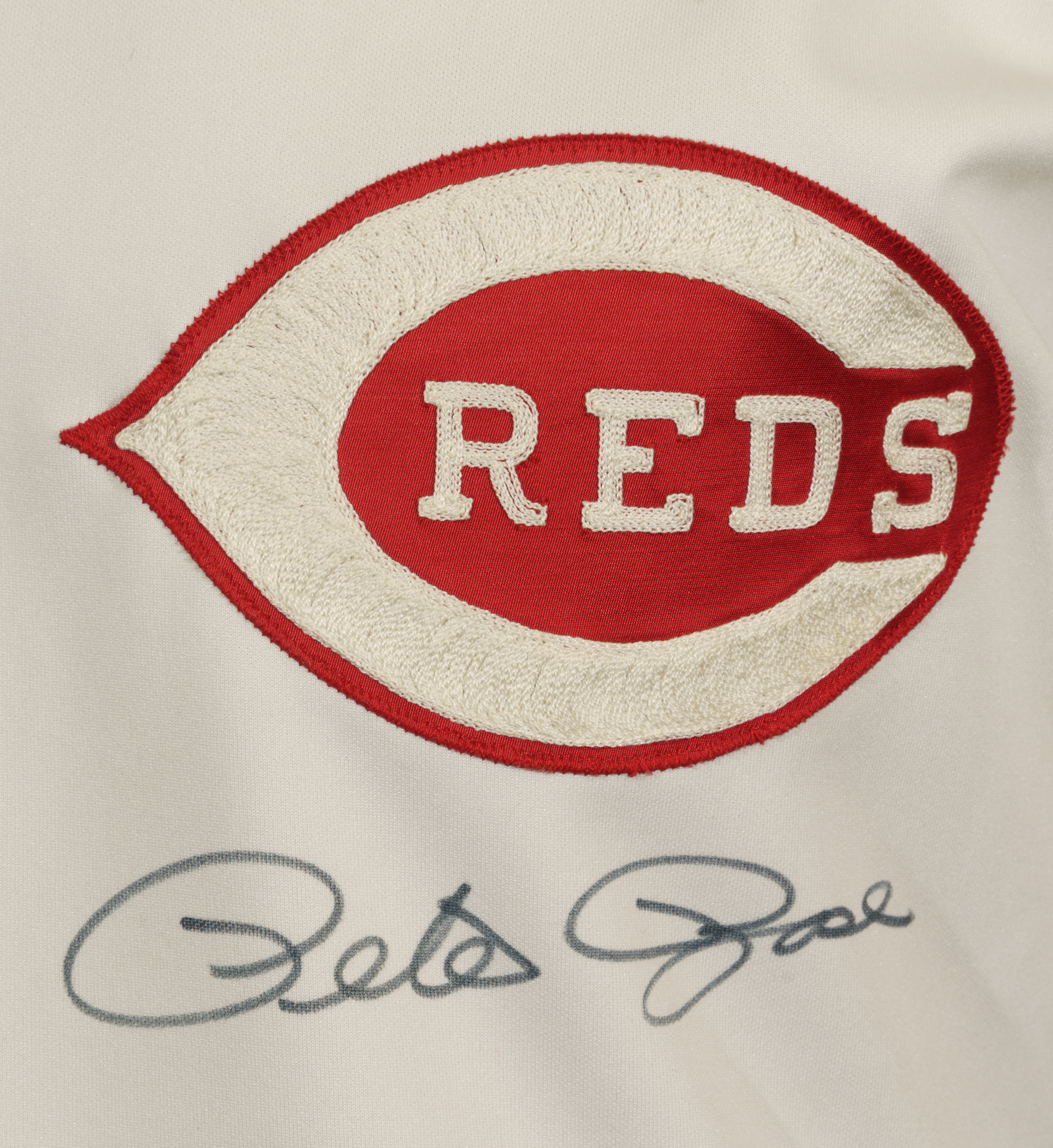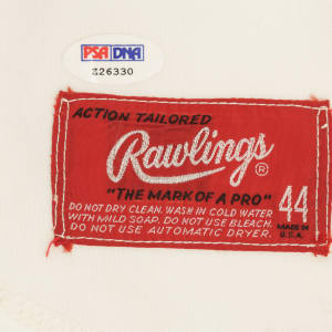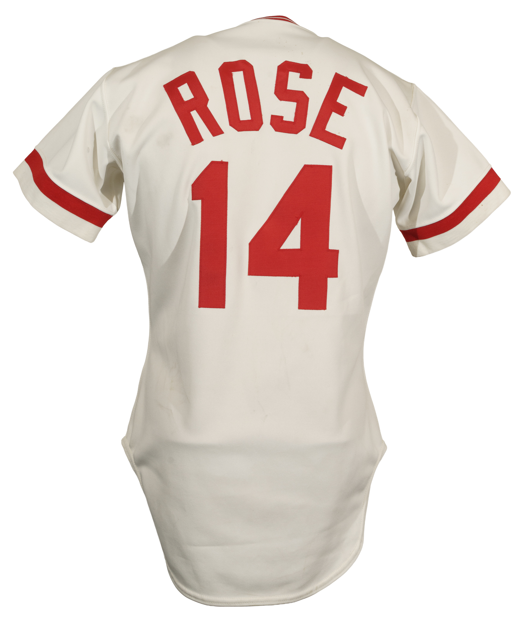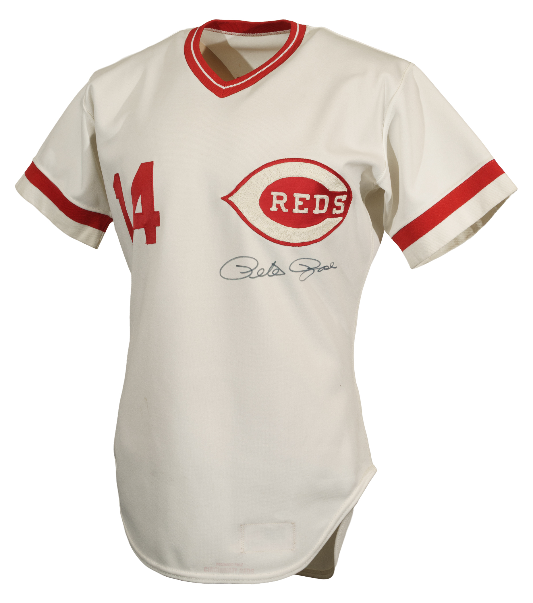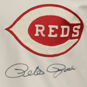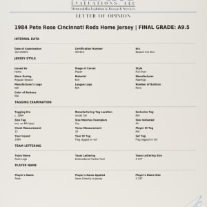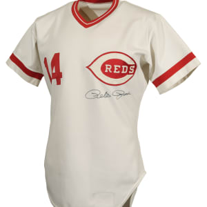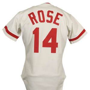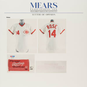 Cincinnati Reds home jersey worn by baseball's all-time hit king Pete Rose during the 1984 season. Graded A9.5 by MEARS. The white knit jersey features the Reds team logo on the left breast and the number "14" on the right breast and reverse. "Rose" is lettered on the reverse, directly above the number. All letters and numerals are appliquéd in solid red tackle twill. A "Rawlings 44" label is situated inside the front tail, directly to the right which is a flag tag reading "Set 1 1984." The red ink stamp "Purchased from Cincinnati Reds" is faintly visible below the manufacturer's tag. Rose has signed the jersey in black ink on the front. The jersey is original as issued, with no alterations, and displays moderate wear, including some minor staining on the reverse. Because of his seemingly boundless enthusiasm, Pete Rose was nicknamed "Charlie Hustle" by Whitey Ford. He is the career leader in hits (4,256), singles (3,215), at-bats (14,053) and games played (3,562). He is the only player to play 500 games at five different positions and in 1999 was named to baseball's "All-Century Team." Despite his problems on and off the field, Rose will forever be remembered as one of the greatest players to ever take the field, and, like Joe Jackson, will always be a member in spirit of the Hall of Fame, though he may never be formally enshrined. Graded A9.5 by MEARS (10-point base grade with a half point deducted for the staining). Full LOA from MEARS (jersey only). Basic Certification from PSA/DNA (autograph only).