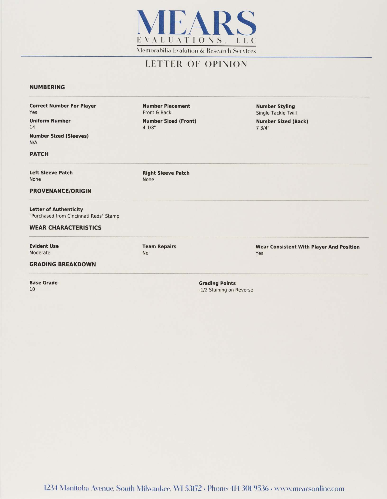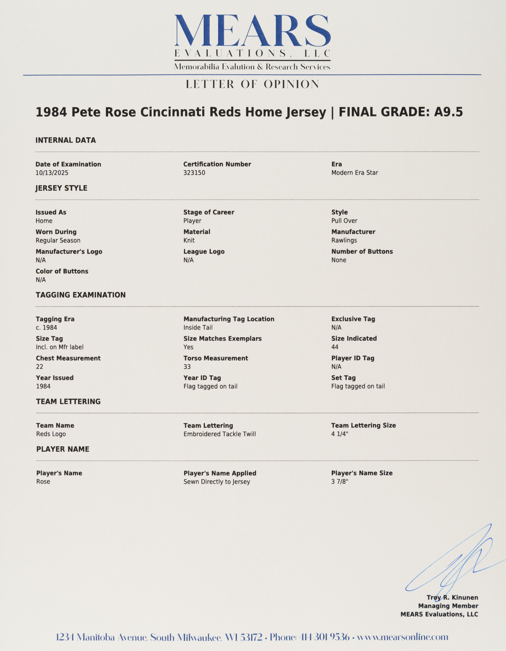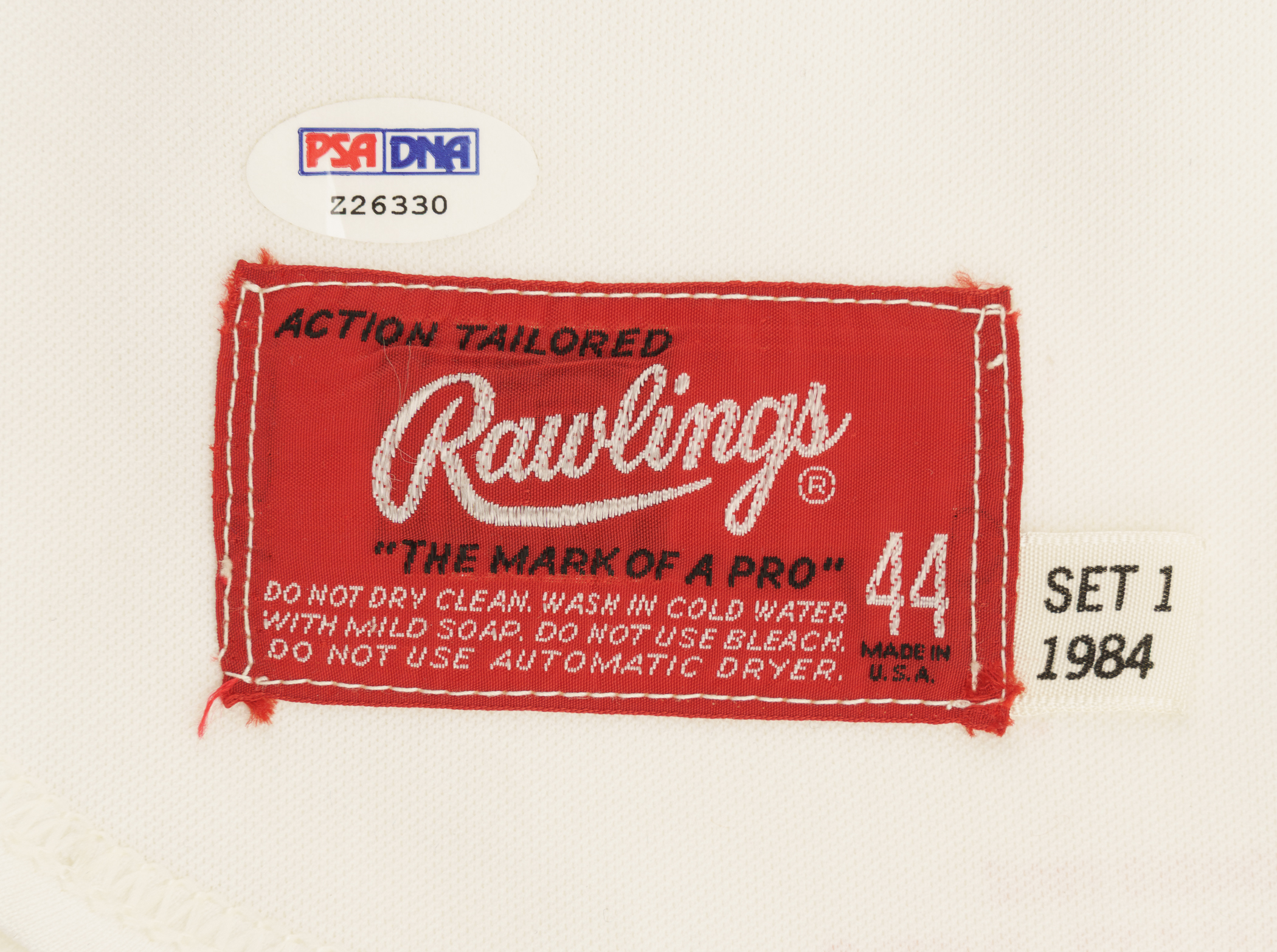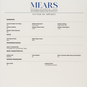 Cincinnati Reds home jersey worn by baseball's all-time hit king Pete Rose during the 1984 season. Graded A9.5 by MEARS. The white knit jersey features the Reds team logo on the left breast and the number "14" on the right breast and reverse. "Rose" is lettered on the reverse, directly above the number. All letters and numerals are appliquéd in solid red tackle twill. A "Rawlings 44" label is situated inside the front tail, directly to the right which is a flag tag reading "Set 1 1984." The red ink stamp "Purchased from Cincinnati Reds" is faintly visible below the manufacturer's tag. Rose has signed the jersey in black ink on the front. The jersey is original as issued, with no alterations, and displays moderate wear, including some minor staining on the reverse. Because of his seemingly boundless enthusiasm, Pete Rose was nicknamed "Charlie Hustle" by Whitey Ford. He is the career leader in hits (4,256), singles (3,215), at-bats (14,053) and games played (3,562). He is the only player to play 500 games at five different positions and in 1999 was named to baseball's "All-Century Team." Despite his problems on and off the field, Rose will forever be remembered as one of the greatest players to ever take the field, and, like Joe Jackson, will always be a member in spirit of the Hall of Fame, though he may never be formally enshrined. Graded A9.5 by MEARS (10-point base grade with a half point deducted for the staining). Full LOA from MEARS (jersey only). Basic Certification from PSA/DNA (autograph only).