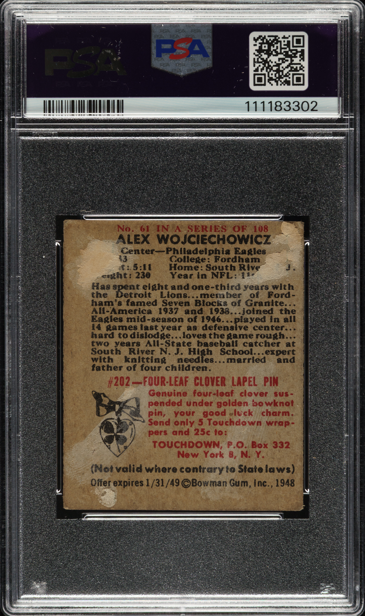 PSA/DNA has encapsulated the card, grading the signature NM 7 and certifying the card as "Authentic." Philadelphia Eagles football Hall of Famer Alex Wojciechowicz.