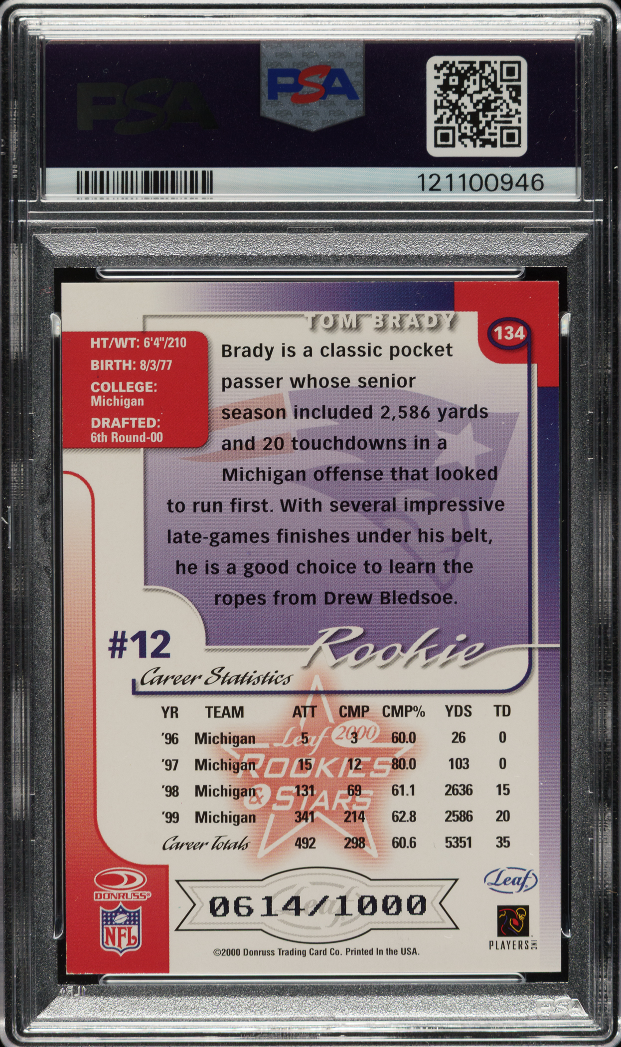 Lot # 2555: 2000 Leaf Rookies & Stars #134 Tom Brady Rookie #614/1,000 PSA NM 7