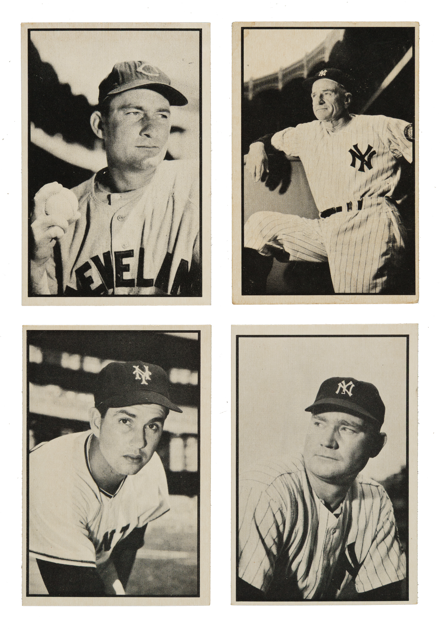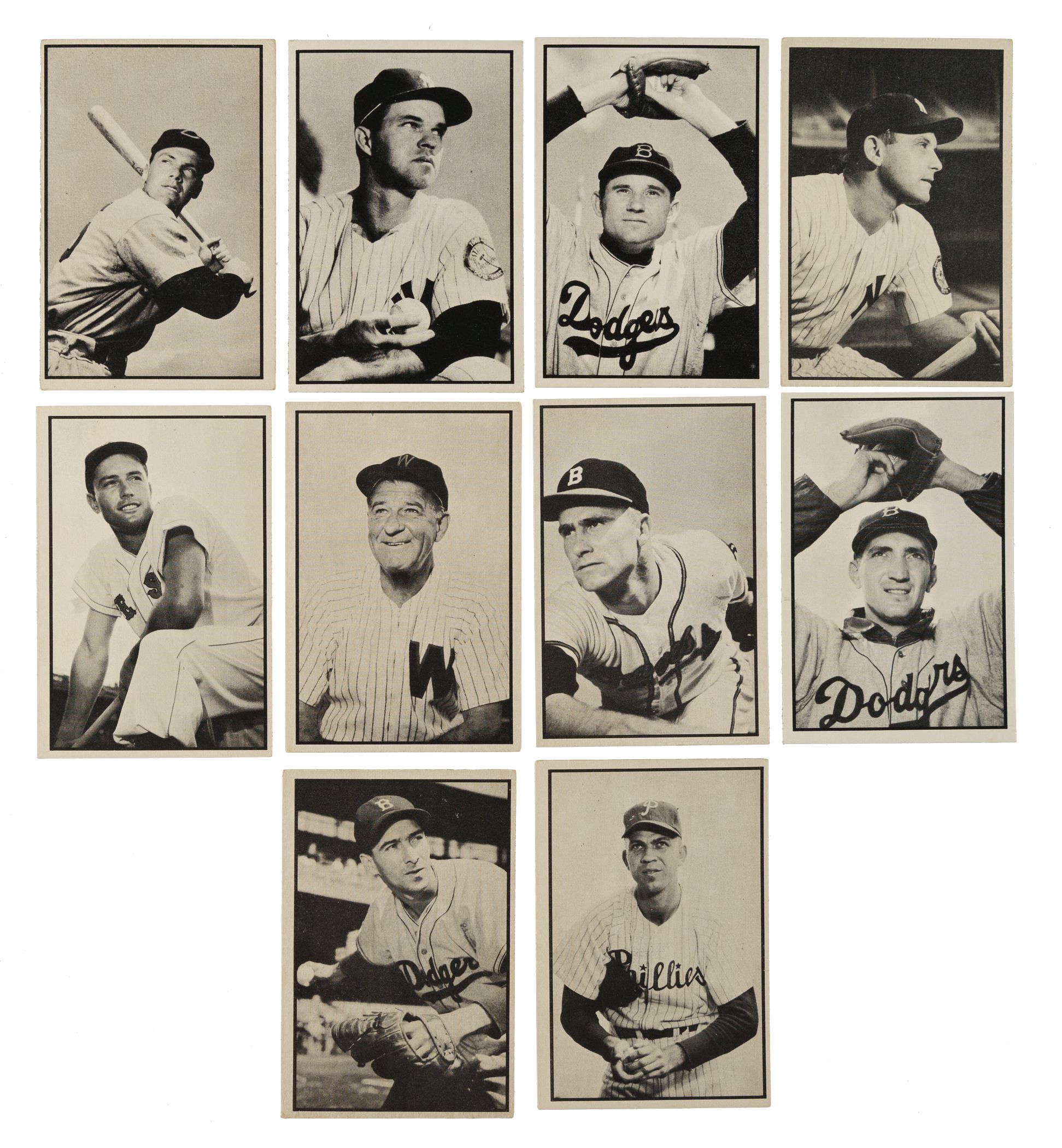 Complete 1953 Bowman B&W 64-card set. The unusual Bowman B&W set is by far the scarcer of the two 1953 Bowman baseball issues. Condition is 31% Ex to Ex-Mt (mostly Ex), 62% Vg to Vg-Ex, and 7% lesser. Keys: #1 Bell (Vg+), 15 Mize (Vg-Ex), 25 Sain (Vg-Ex+), 26 Roe (Ex+), 27 Lemon (Vg-Ex+), 28 Wilhelm (Ex-Mt), 31 Woodling (Vg-Ex), 36 Piersall (Vg-Ex), 39 Stengel (Fr), 46 Harris (Fr due to spot of paper loss on reverse), 51 Burdette (Ex), 52 Branca (Vg-Ex), 60 Cox (Vg+), and 64 Hansen (Vg-Ex+). The 1953 Bowman B&W set gets less attention than the 1953 Bowman Color set because it is a smaller set and has fewer stars (and there is no Mantle) but in the "old days" of collecting, the 1953 Bowman B&W cards were far more desirable to many collectors, and were appreciated for their greater rarity, more so than in modern collecting times. This is a very attractive mid-grade set. Total: 64 cards.