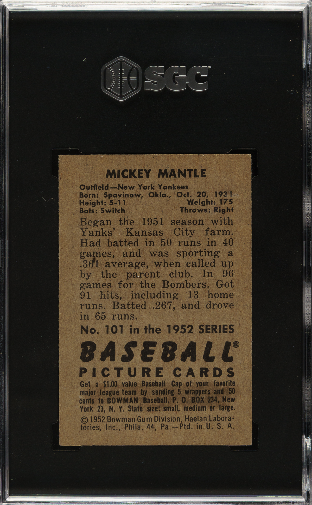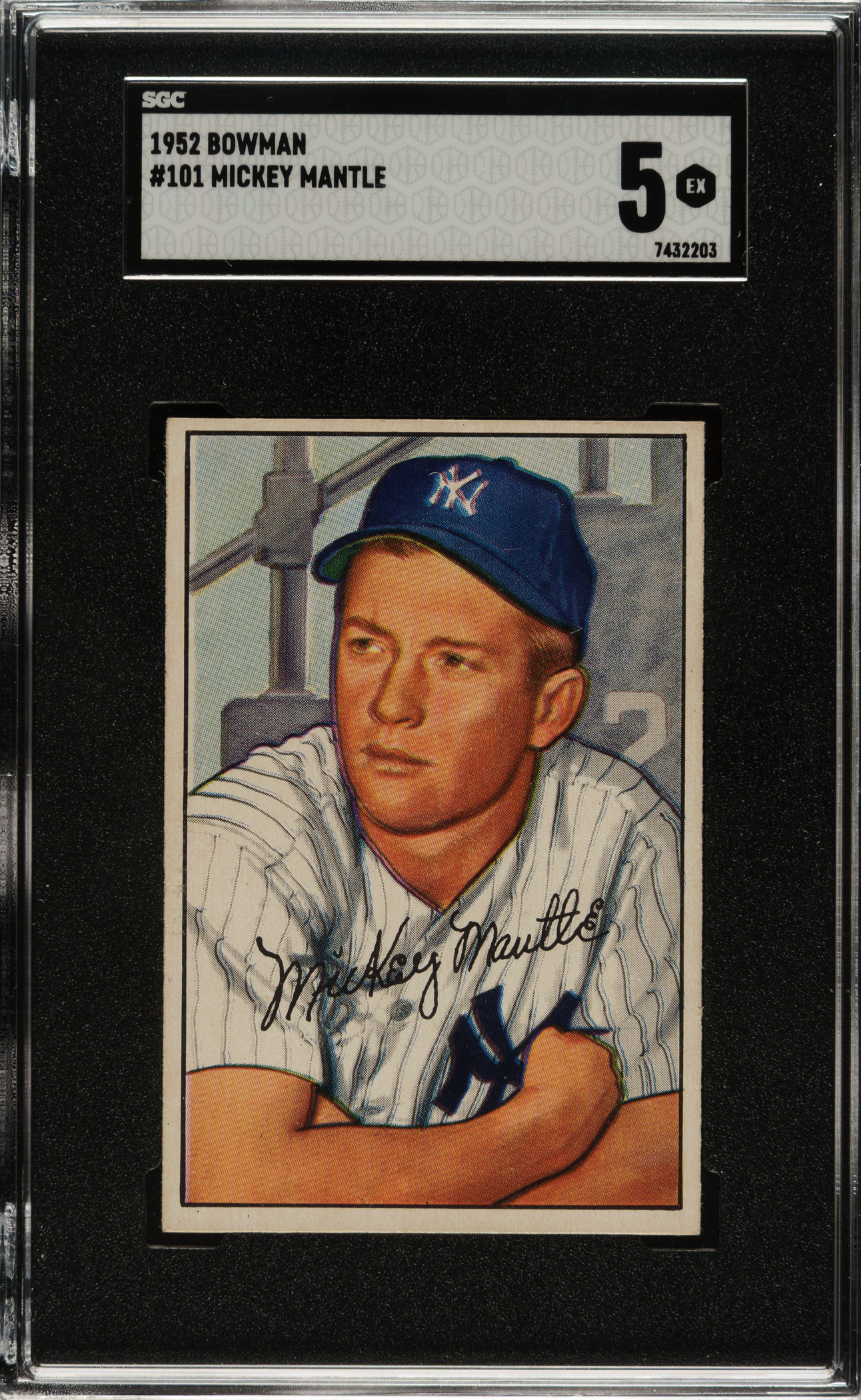 Graded EX 5 by SGC. Mid-grade example of one of collecting's classic cards, the 1952 Bowman #101 Mickey Mantle. This card has bright colors and light corner wear. A small patch of staining is visible along the lower portion of the reverse. An attractive mid-grade example of one of New York Yankees Hall of Famer Mickey Mantle's most important cards.