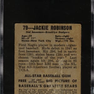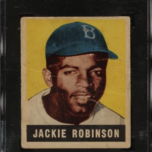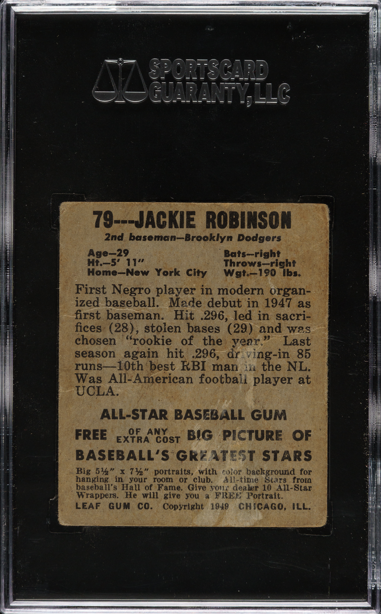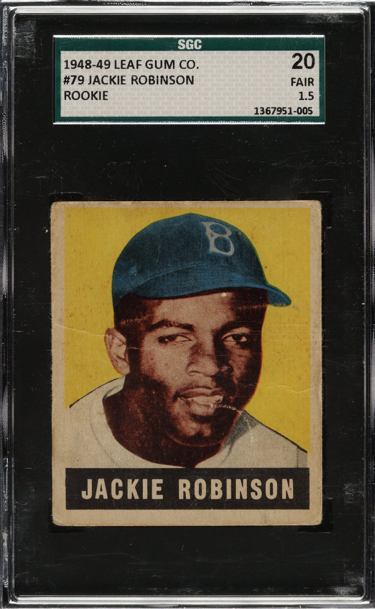 Graded FAIR 1.5 by SGC. Modestly graded example of this classic rookie card of Brooklyn Dodgers Hall of Famer Jackie Robinson. The 1948-1949 Leaf card of Robinson is one of the most popular, striking, and classic of all his cards. Leafs are often encountered with many condition problems (excessive toning, general wear from fragile paper stock, soft corners, centering issues, and print lines), and collectors also must deal with the wildly varying degrees of print quality that characterize the set. It is easy to see why 1948-1949 Leaf is one of the most difficult of all issues to collect in high grade. The offered card has bright colors and a crisp image of Robinson. Flaws include honest corner wear and heavy creasing (including one extending through Robinson's face).