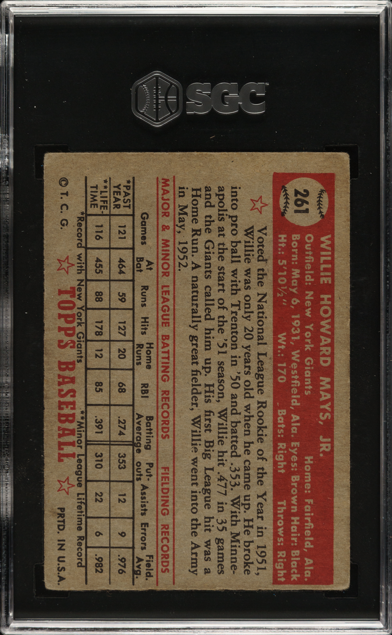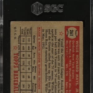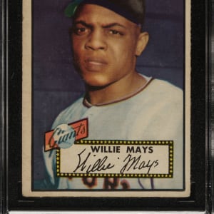 Graded VG 3 by SGC. Attractive mid-grade example of New York Giants Hall of Famer Willie Mays from the 1952 set, one of collecting's most classic cards. The offered card features a bold purple background, excellent registration, even corner wear, and light creasing on the bottom-right quadrant (most visible from the reverse). This is a solid example of one of Willie Mays' most important cards.