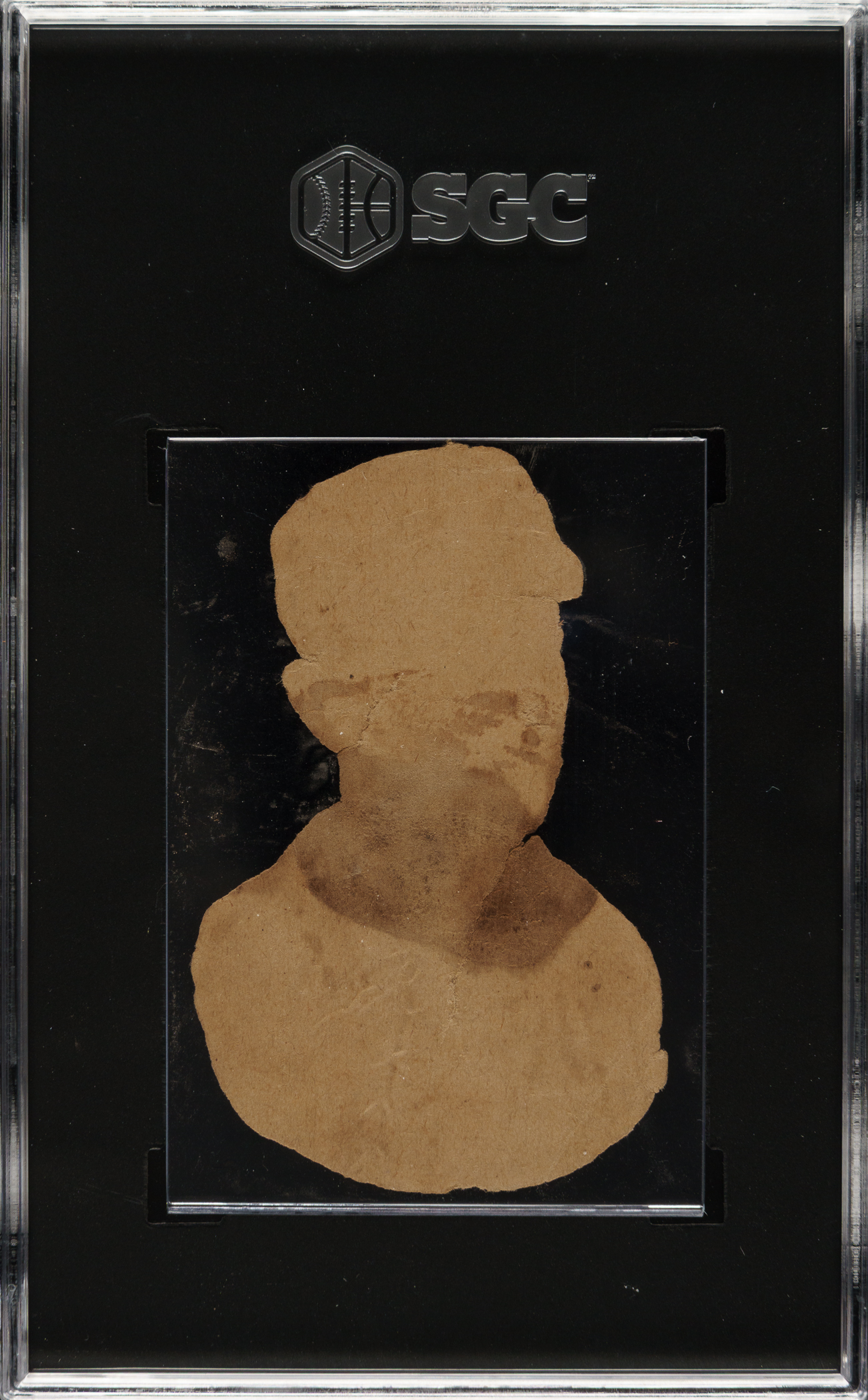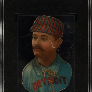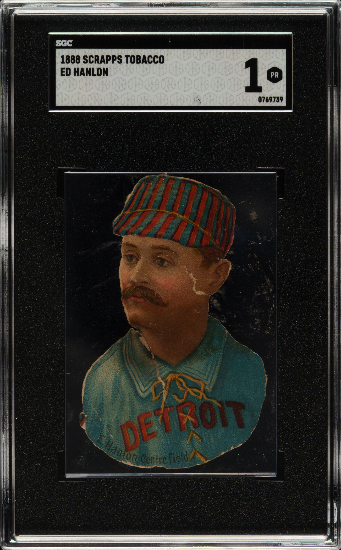Graded POOR 1 by SGC. Modestly graded example of this early classic card of Hall of Famer Ned Hanlon from the unusual 1888 H. D. Smith & Company Baseball Gum Card Die-Cuts series. This uniquely designed issue features nine players from the American Association’s legendary St. Louis Brownie Champs and nine players from the Detroit Wolverines. It is one of only a few full-color baseball issues from the nineteenth century and also one of the most distinctive and unusual of all early baseball card sets. For decades, the set was referred to as "Scrapps" or "Scrapps Tobacco," but recent extraordinary newspaper archive research has finally allowed for the definitive identification of the issuer: H. D. Smith & Company, a Cincinnati Candy and Gum manufacturer. The hobby has long known that these die-cuts were not actually issued by "Scrapps Tobacco" (as no brand of that name has ever been found) but we personally never thought we would ever learn exactly how they were issued. The fact is, they were actually issued as premiums with gum! These cards were intended to be glued into scrapbooks and almost always display evidence of glue residue or album removal on the reverse. The offered example is no exception. The card presents with bold colors on the front but ultimately grades very modestly due to evidence of album removal on the reverse and two small tears. Despite the flaws, this is a very high-quality Hall of Famer example with strong visual appeal.