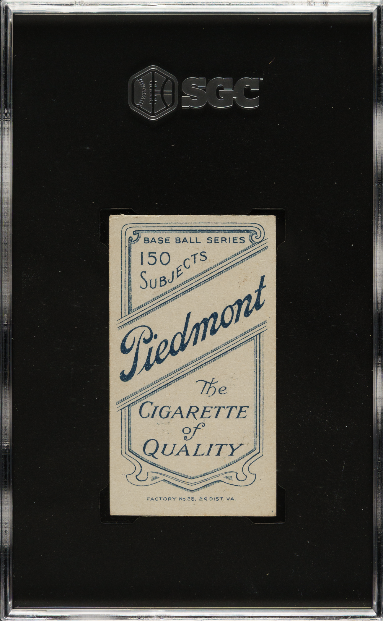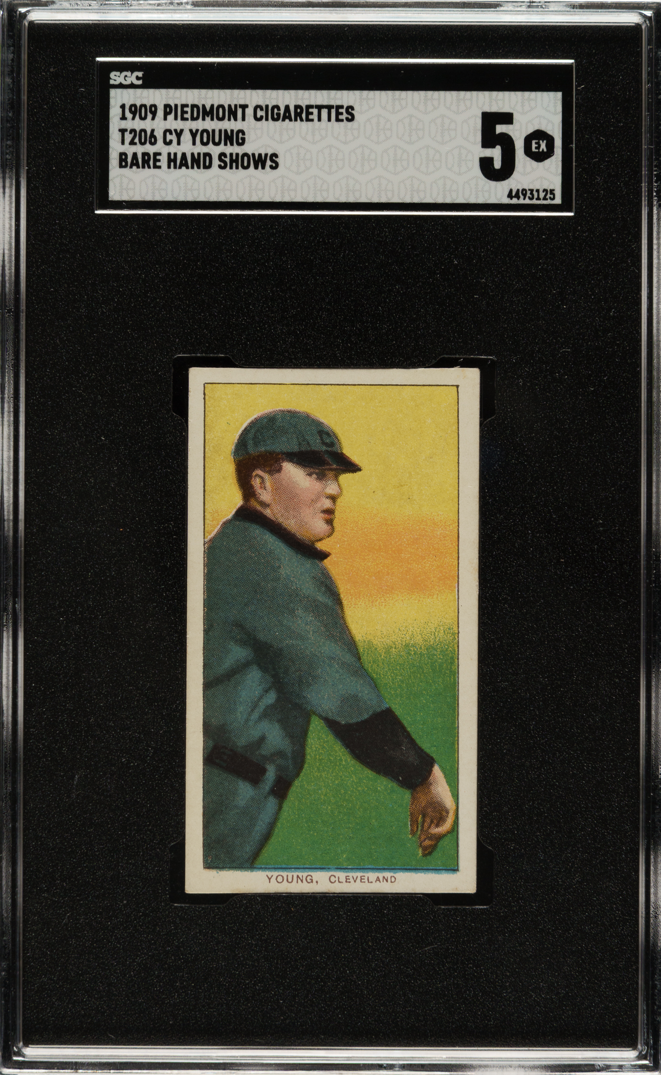 Graded EX 5 by SGC. Beautiful mid-grade example of Cleveland Naps Hall of Fame pitcher Cy Young (bare-hand-showing pose). This example displays vibrant colors, a crisp image, and strong corners with light touches of wear. Boldly printed Piedmont 150/25 advertising reverse.