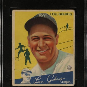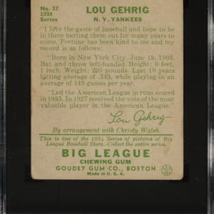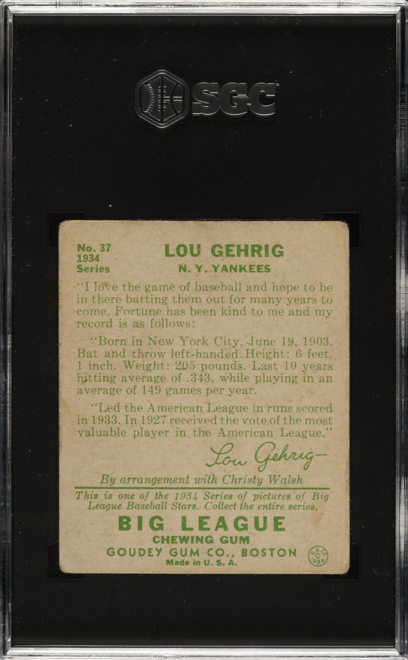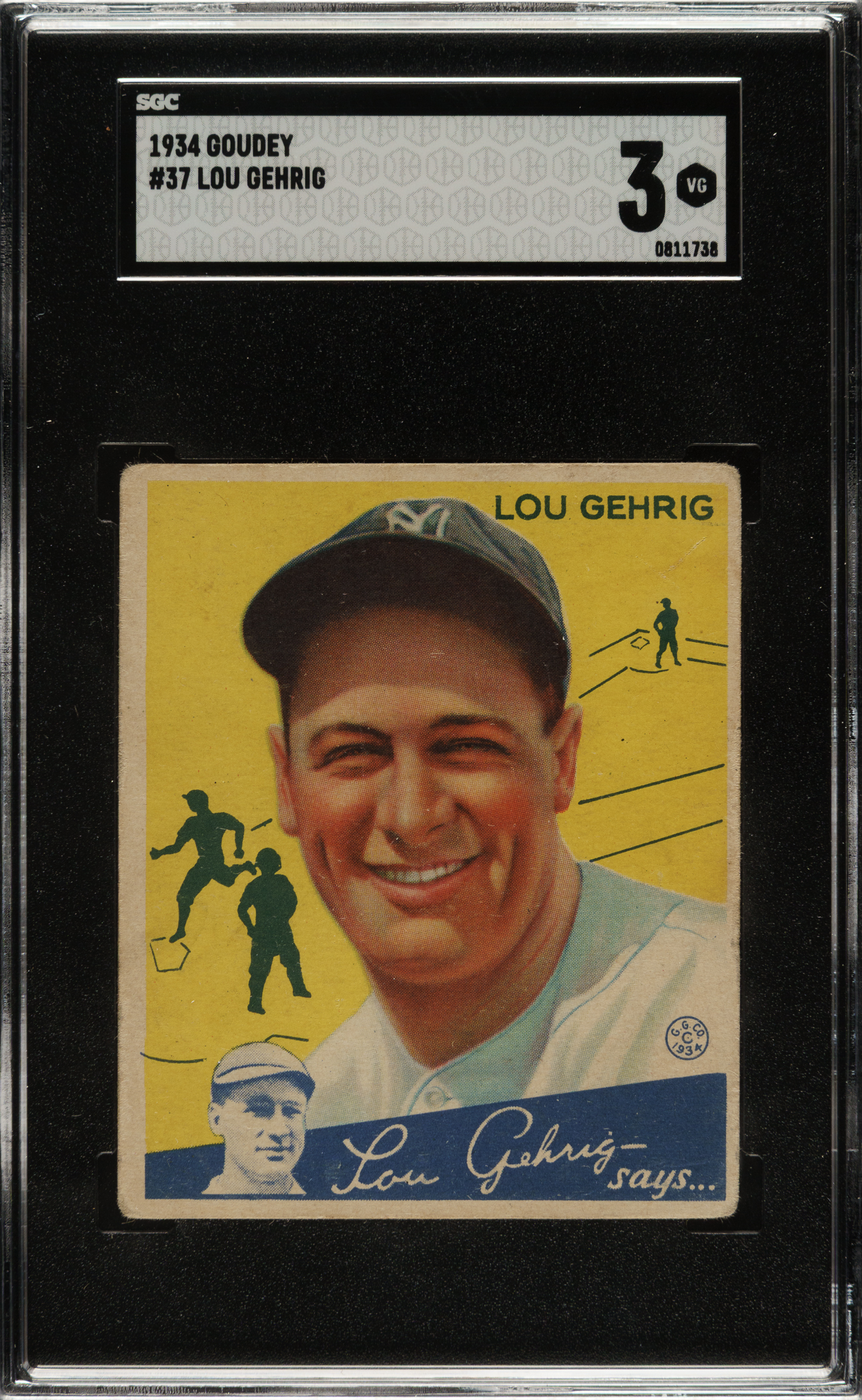 Graded VG 3 by SGC. Mid-grade example of one of the most popular of all Lou Gehrig cards: 1934 Goudey Gum #37. This card is a classic. This example has bright colors, a crisp image, moderate corner wear, and a couple light creases. Clean reverse with bold green text.