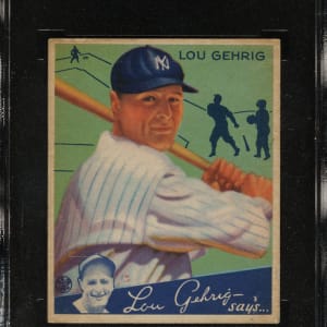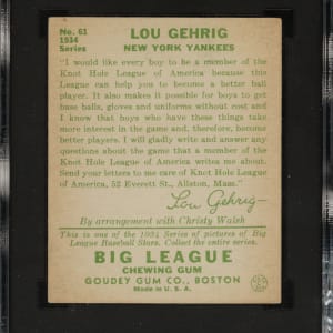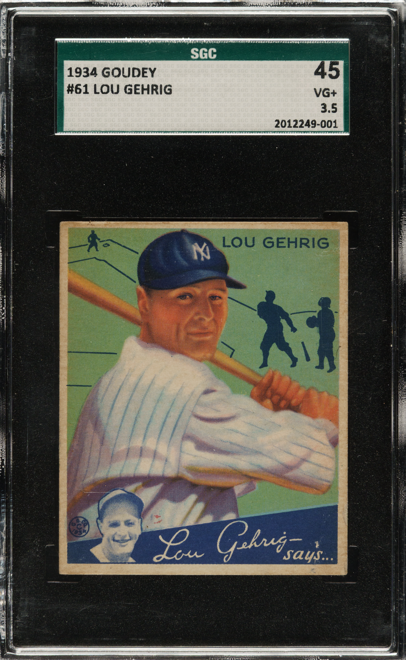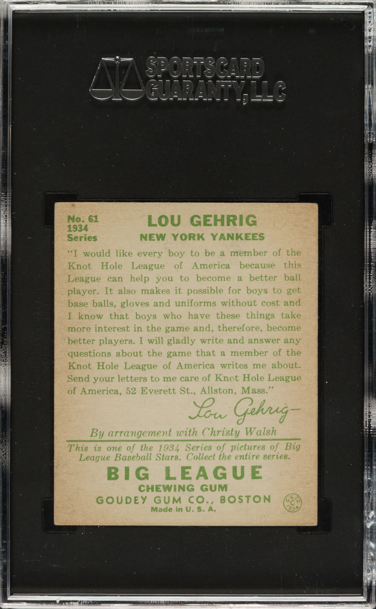 Graded VG+ 45 by SGC. Attractive mid-grade example of this classic Lou Gehrig card, one of the most popular of all of his cards and all 1930s bubble-gum cards. The 1934 Goudey "Lou Gehrig says..." series features an additional Gehrig portrait on the front and words by him on the reverse (in the case of this card, an invitation to join Goudey's Knot Hole League of America club and to personally write him with questions about the game, which no doubt kept Christy Walsh or someone at Goudey very busy). This example boasts vibrant colors, a crisp image, and light corner wear. The reverse displays boldly printed green text and light toning. This is an outstanding card: It's easy to see why it is not only one of the great Goudey cards that represents Gehrig in his prime but also one of the best of all 1930s bubble-gum cards. A strong example of one of Gehrig's most desirable cards.