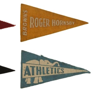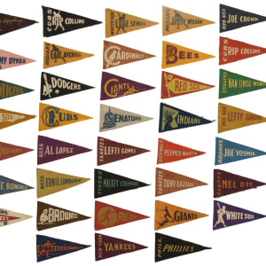 Presented is a sizeable collection of forty-two different 1936-1937 BF3 pennants. Technically the condition ranges from Pr to Vg (many have a pinhole visible), averaging Good overall. This collection consists of the following: Type 2 (6 pennants): Appling, Averill, R. Collins, Dykes, Sewell, and J. Wilson. Type 3 (15 pennants): Bonura, Cochrane, R. Collins, Cronin, DiMaggio, Gomez, Grove, Hornsby, Lazzeri, Lombardi, Lopez, P. Martin, Mungo, Ott, and Vosmik. Type 4 (5 pennants): Browns, Giants, Phillies, Reds, and White Sox. Type 5 (13 pennants): Athletics, Bees, Cardinals, Cubs, Dodgers, Giants, two Indians, Pirates, two Red Sox, Senators, and Tigers. Type 6 (2 pennants): Phillies and Yankees. Type 8 (1 pennant): Yankees/1936 Champions. Total: 42 pennants.