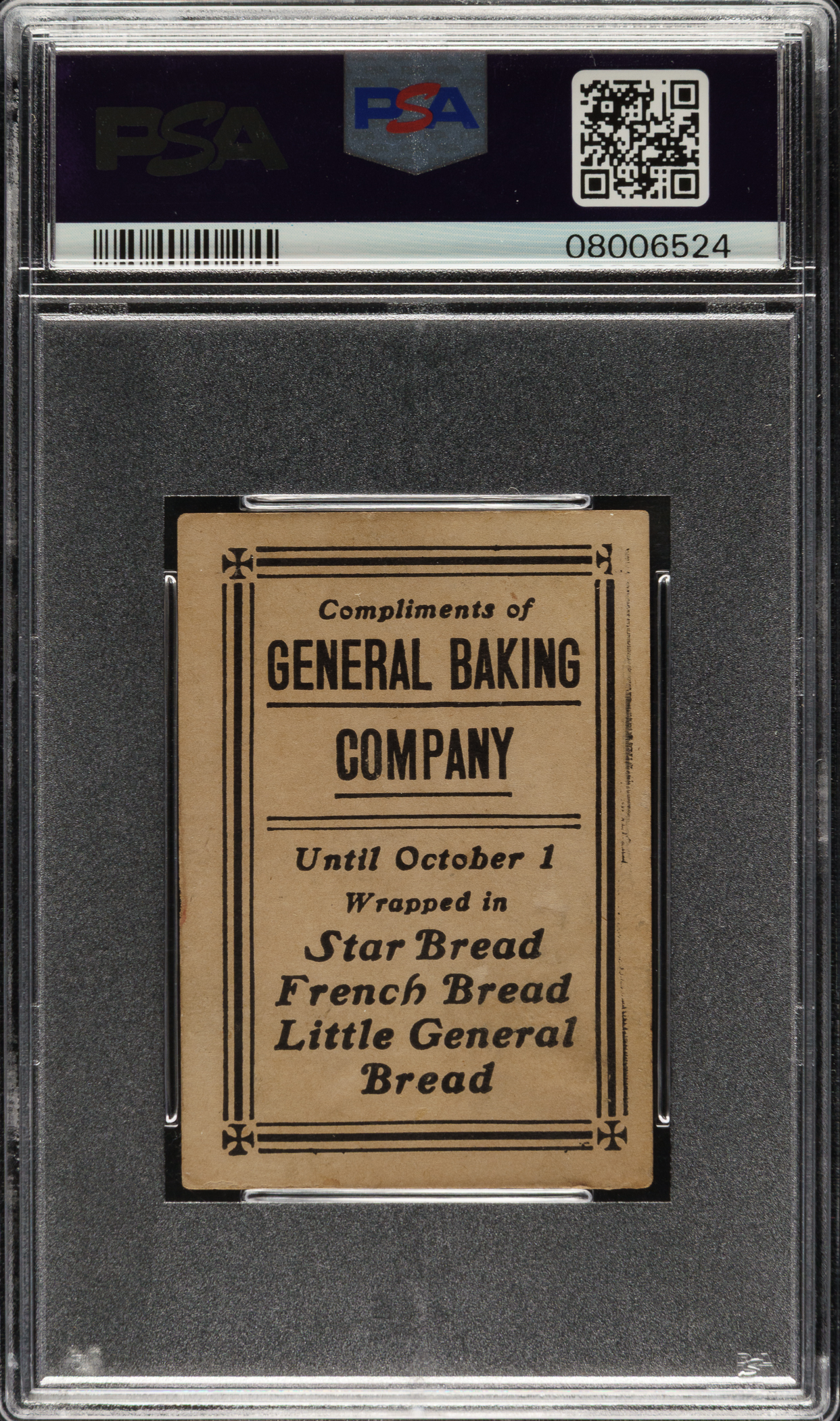 Graded VG-EX 4 by PSA. This is the ONLY example of this front/back combination graded at this level by PSA with none higher! Presented is the key Hall of Famer from the extremely rare 25-card D304 General Baking Co. brand bread series. This is one of Ty Cobb's rarest and most striking cards. Issued by a bakery in the Buffalo, New York area, these cards are known to have five different back styles (Brunners, Butter Krust, General Baking Co., Weber Bakery, and Martens Bakery). Similar in design to tobacco and candy cards of the era, D304s measure slightly larger than T206s, at 1.75 x 2.5 inches, And while not “on the radar” of most collectors, they are actually considerably rarer than most 1910-era “E” and “T” card issues. The fronts feature very attractive full-color illustrations, each of which is unique to this issue. In recent years, collectors have shown a growing appreciation for the mystique of the rarest vintage-card issues. D304s certainly fall into this category and have always been appreciated but are rarely offered. D304s were issued in 1911, 1912, 1913, and 1914. The offered card displays bold colors, a strong image, even corner wear, and scattered surface wear along Cobb's bat. The important advertising reverse is boldly printed. This is a very attractive mid-grade example of one of Ty Cobb’s — and all of card collecting's — rarest, most majestic, and revered prewar cards.