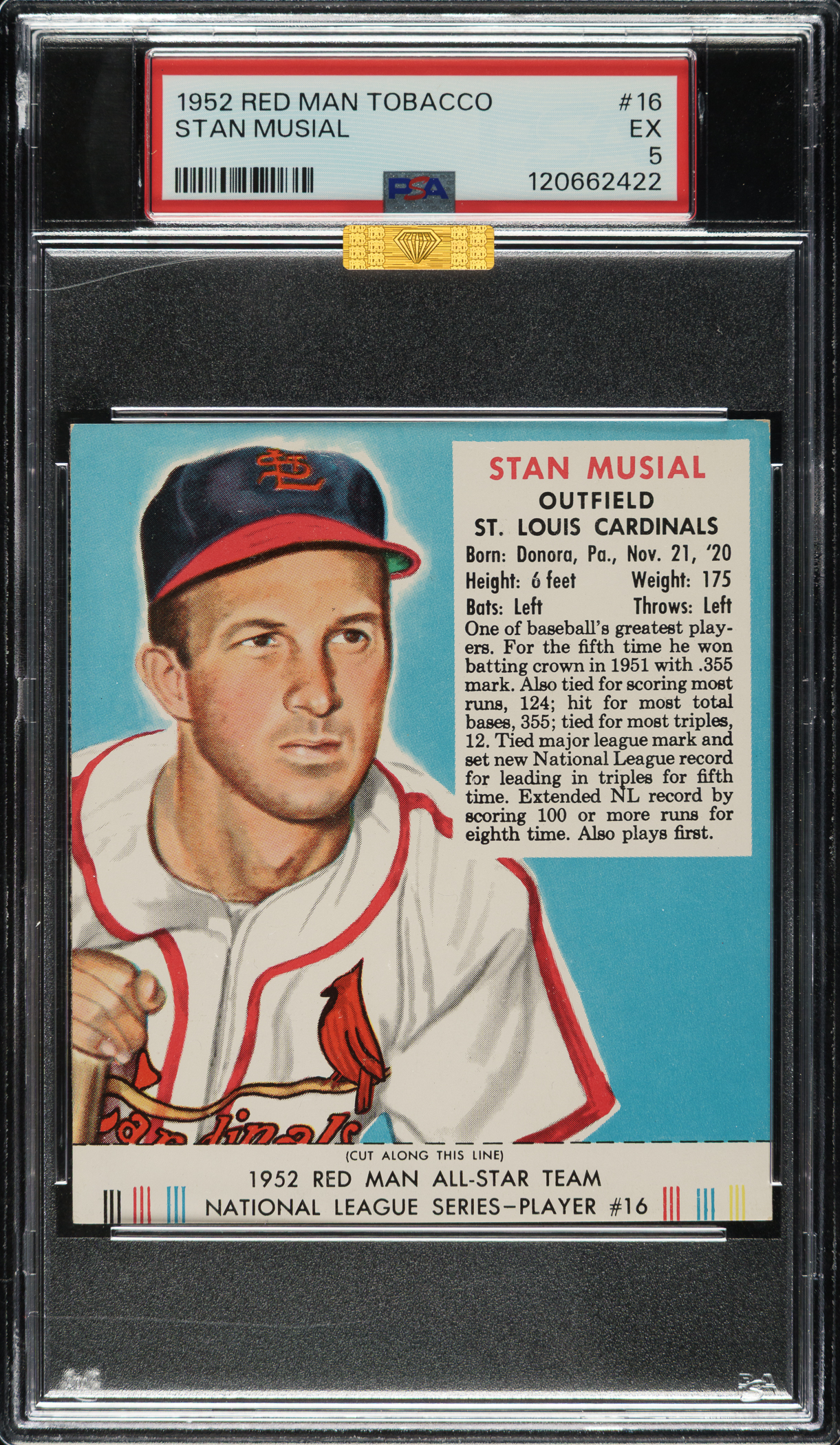 Graded EX 5 by PSA. St. Louis Cardinals Hall of Famer Stan Musial. Awarded an MBA Gold Diamond by Mike Baker Authenticated for high-end eye appeal. A corresponding MBA sticker is affixed to the front of the holder.