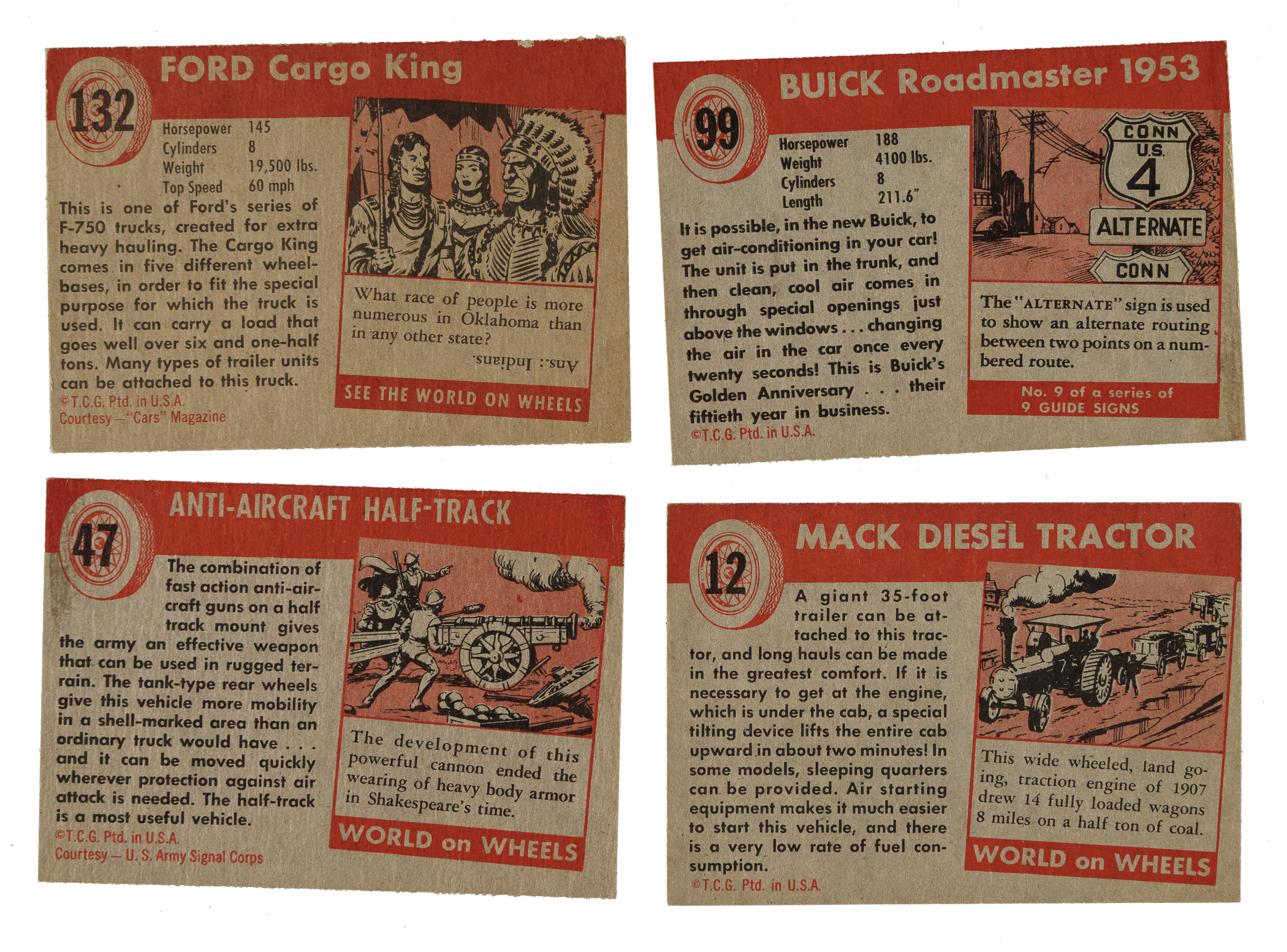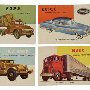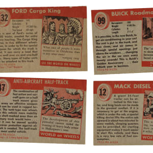 Presented is a complete low-number set of 160 cards from the 1953-1954 Topps "World on Wheels" series. These cards feature beautiful illustrations of many different types of automobiles, from the earliest models to the newest creations of 1954. There were an additional twenty high-number cards #161-180 released at a later time between 1954 and 1955 (which are considered rare), and that featured some of the new 1955 car models. Due to the difficulty of locating high-number examples, particularly the ones from #171-180, most collectors are content to stop at card #160 and call their set complete. Condition ranges from Vg to Vg-Ex (including 5% lesser). Total: 160 cards. The size/weight of this item requires that there will be an additional shipping charge for this lot.