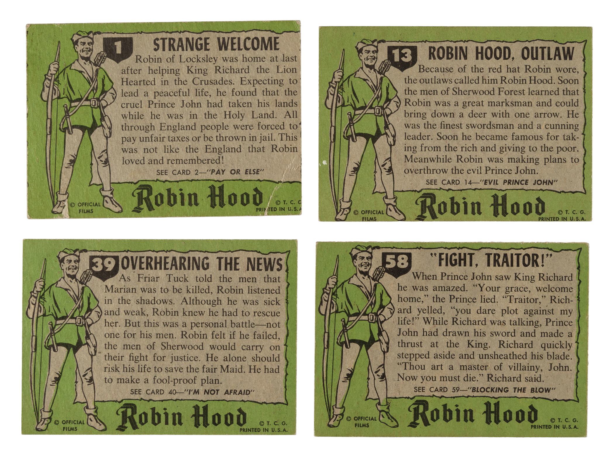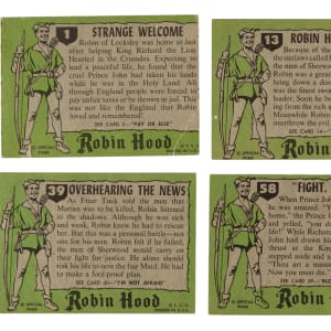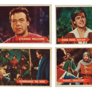 Complete set of 1957 Topps "Robin Hood" trading cards. Condition is 17% Ex to Ex-Mt, 54% Vg to Vg-Ex, and 29% Gd (due mostly to 100/0 centering and including a couple lesser). Total: 60 cards. The size/weight of this item requires that there will be an additional shipping charge for this lot.