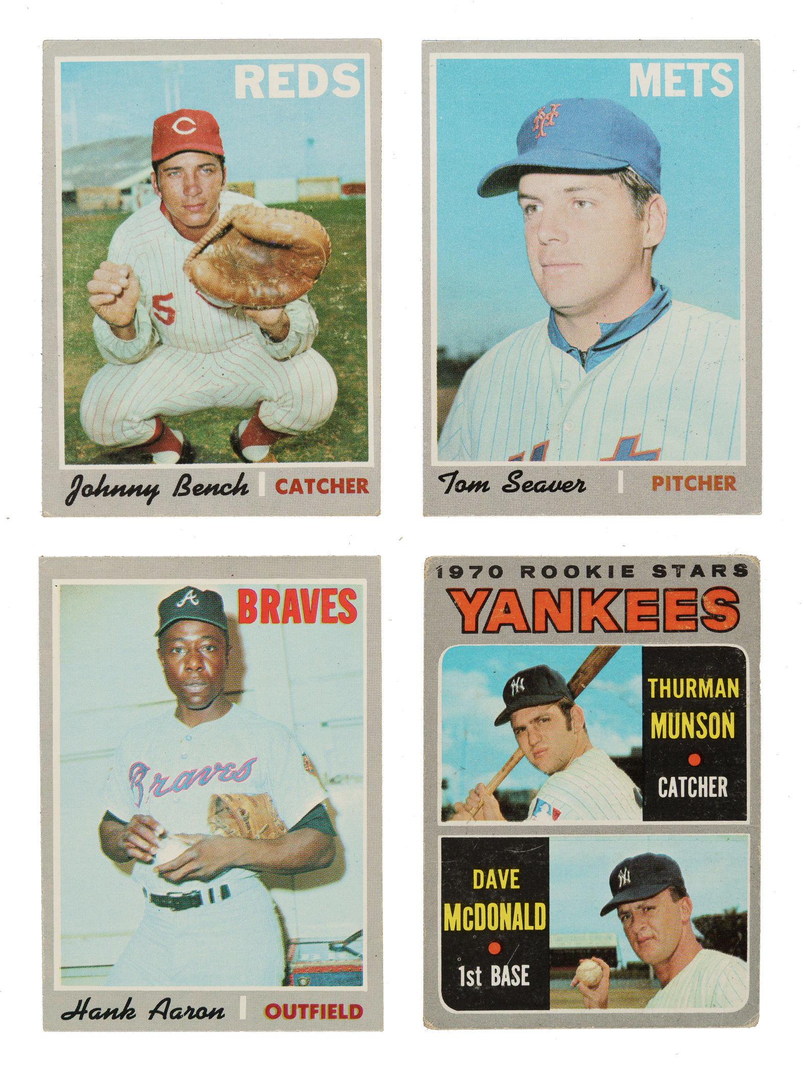 Very attractive complete 1970 Topps set. At 720 cards, the 1970 Topps set was the largest set of Topps cards issued to that date. Condition is 26% Ex to Ex-Mt (including a few Nr/Mt), 64% Vg to Vg-Ex, and 10% lesser. Keys: #1 Mets Team (Gd+), 10 Yastrzemski (Vg), 140 Jackson (Vg), 150 Killebrew (Vg), 189 Munson RC (Fr), 290 Carew (Ex-Mt due mostly to centering), 300 Seaver (Vg+), 350 Clemente (Fr), 449 Palmer (Vg+), 462 Aaron AS (Vg), 500 Aaron (Vg-Ex), 530 Gibson (Ex-Mt due to centering), 580 Rose (Vg), 600 Mays (Vg), 630 Banks (Fr-Gd), 640 Kaline (Ex), 660 Bench (Vg+), 700 F. Robinson (Vg), and 712 Ryan (ink-marked reverse, otherwise Vg). Dating from when sets could not be purchased all at once and had to be assembled by series as they were released throughout the season, this 1970 Topps set includes a countless array of stars and Hall of Famers. This is an attractive mid-grade complete set of this classic 1970s Topps series. Total: 720 cards.