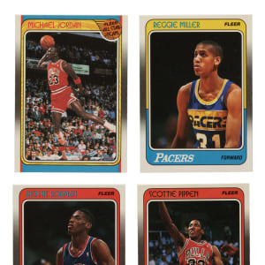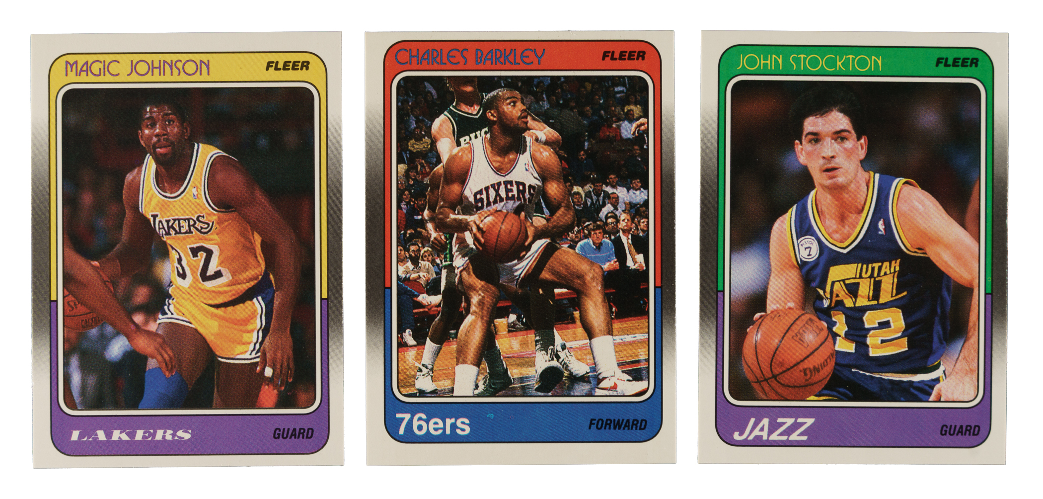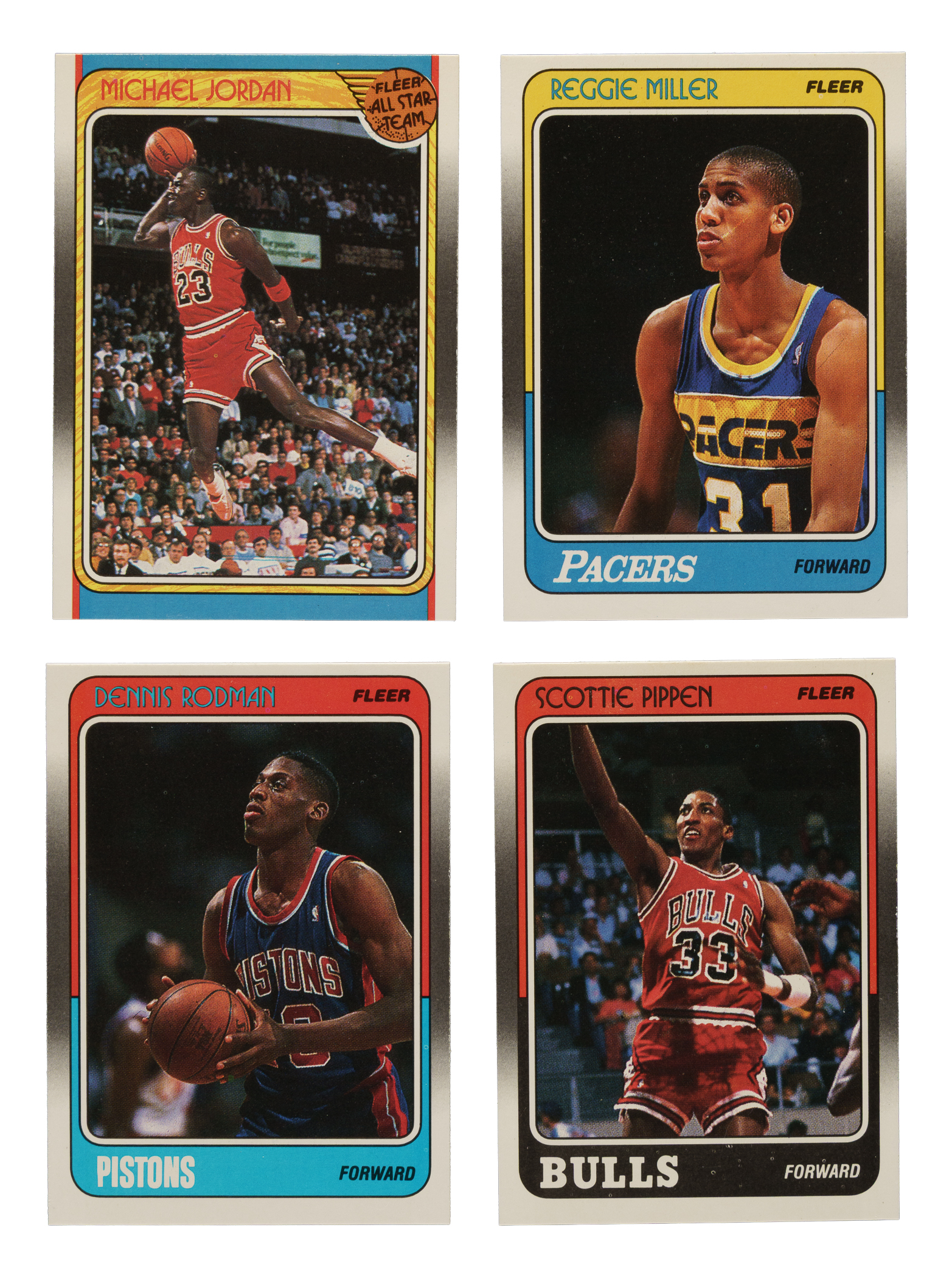 Presented is an outstanding high-grade collection of 1988-89 Fleer basketball cards consisting of a near-complete basic set (129/132) and a near-complete stickers set (9/11). The base set is missing three cards (#9 Bird, 17 Jordan, and 124 Bird AS) for completion and the sticker set is missing two (#2 Bird and 7 Jordan). Condition of the base set is 63% Nr/Mt to Nr/Mt-Mt and 37% Ex to Ex-Mt (including a couple lesser). Keys: #20 Pippen RC (Ex-Mt), 43 Rodman RC (Nr/Mt), 57 Miller RC (Nr/Mt), 67 Johnson (Nr/Mt), 85 Barkley (Ex-Mt), 115 Stockton RC (Nr/Mt-Mt), and 120 Jordan AS (Nr/Mt+). Condition of the stickers set (graded without reference to the wax on the reverse of all) is Ex to Ex-Mt (due to centering), including a couple higher. This is a very attractive high-grade near-complete set of 1988-1989 Fleer basketball cards. Total: 138 cards (129-card base set plus 9-card sticker set). The size/weight of this item requires that there will be an additional shipping charge for this lot.