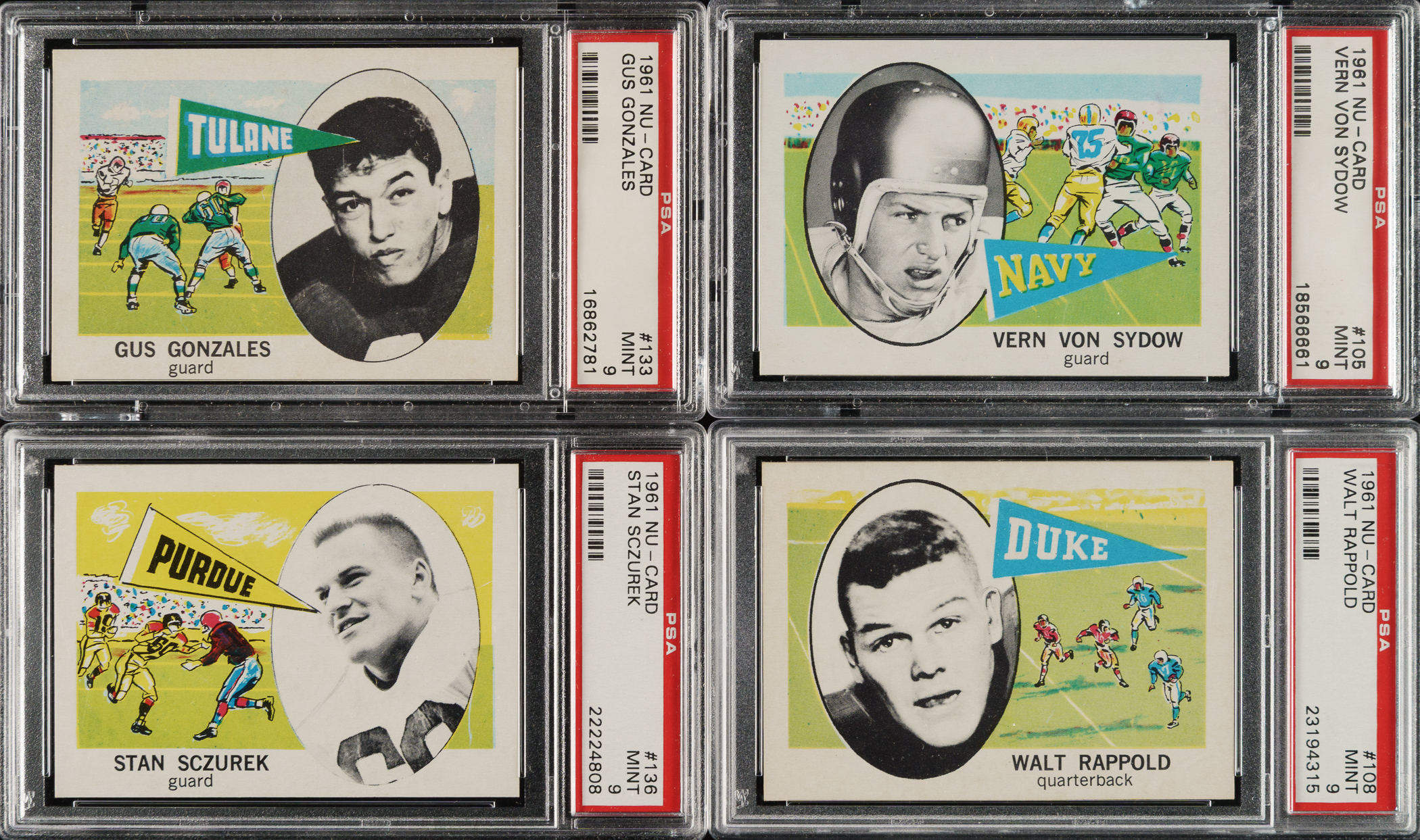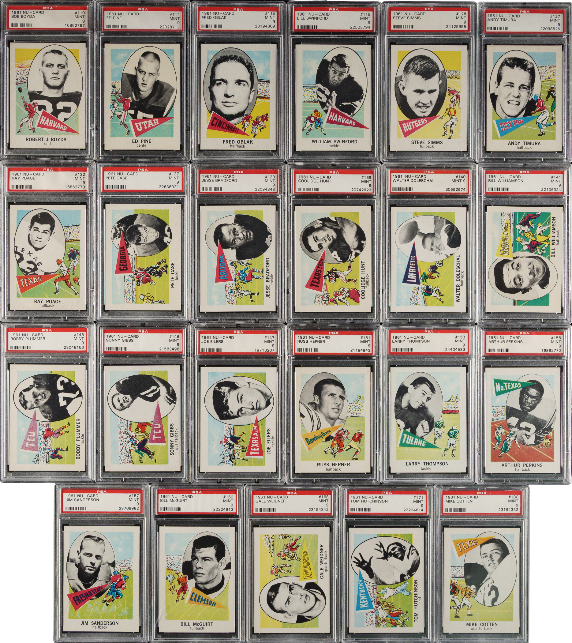 Presented is a collection of twenty-seven different 1961 Nu-Card football cards, each professionally graded and encapsulated MINT 9 by PSA. The 1961 Nu-Card set features college All-American candidates. This collection consists of the following: #105, 108, 110, 114, 115, 119, 126, 127, 132, 133, 136, 137, 138, 139, 140, 141, 145, 146, 147, 151, 153, 156, 157, 160, 168, 171, and 180. Total: 27 cards. The size/weight of this item requires that there will be an additional shipping charge for this lot.