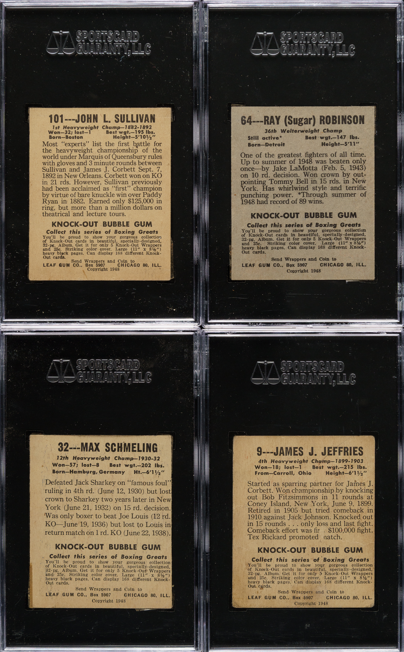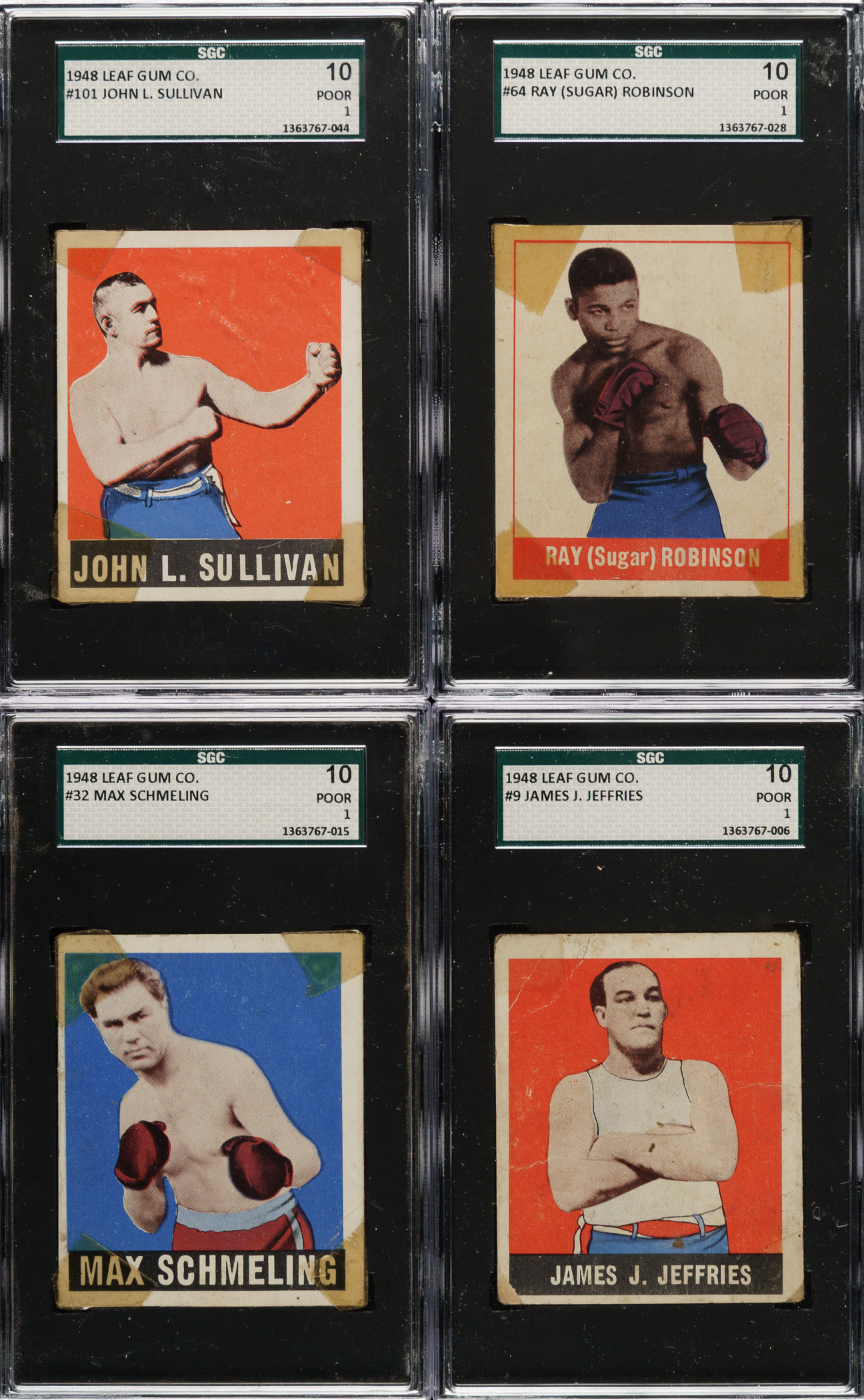 The 1948 Leaf series is one of the most popular boxing sets ever issued. This set includes all the major boxing greats up to that time and has always been a favorite with collectors. Offered is a modestly graded partial set of Leaf Boxing, consisting of twenty-six white backs and nine gray backs for a total of thirty-five different cards (out of 49 in the set). All thirty-five cards have been professionally graded and encapsulated by SGC. Missing the following fourteen cards for completion: #1 Dempsey, 2, 17 Johnson, 19, 20, 27, 36, 42, 47, 48 Louis, 51, 58, 73 Tunney, and 74. SGC Grading Composite: FAIR 20 (1 card): #13. POOR 10 (34 cards): #3, 7, 8, 9 Jeffries, 15, 18, 24, 25 Attell, 29, 32 Schmeling, 33, 35, 38 Sharkey, 44, 55 Corbett, 57, 60, 63 Fitzsimmons, 64 Robinson (gray back), 65, 67, 69, 71, 77, 78, 80, 82, 88, 90, 93 Baer, 95, 98, 101 Sullivan, and 102 LaMotta. This is a presentable lower-graded partial set of this very popular boxing-card series. Total: 35 cards. The size/weight of this item requires that there will be an additional shipping charge for this lot.
