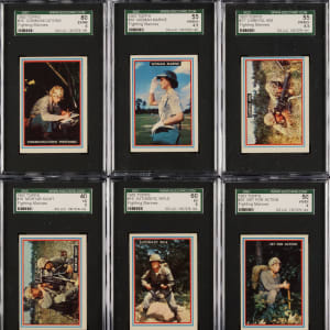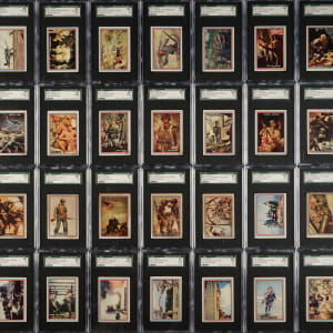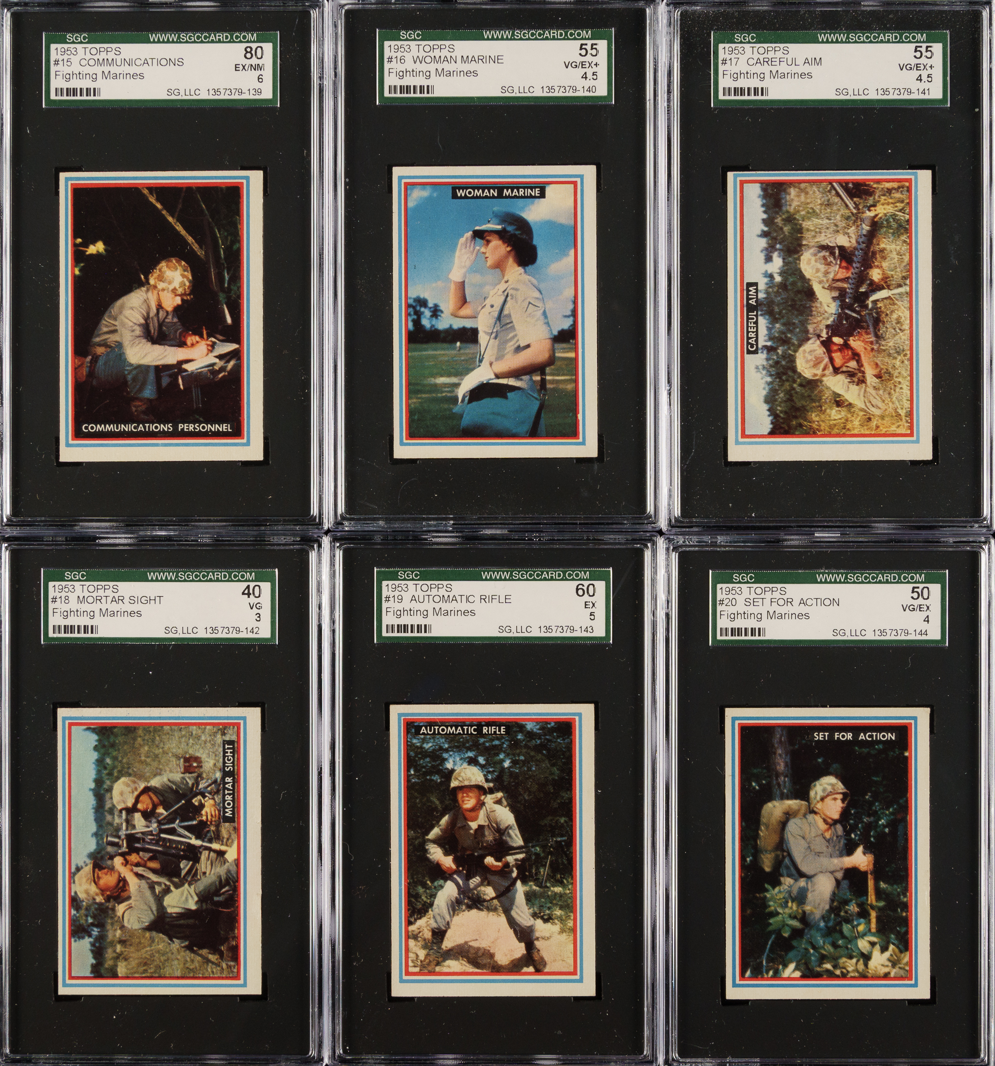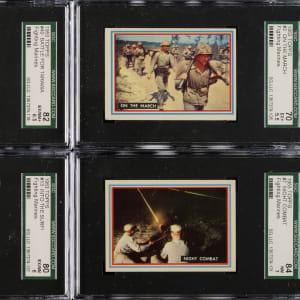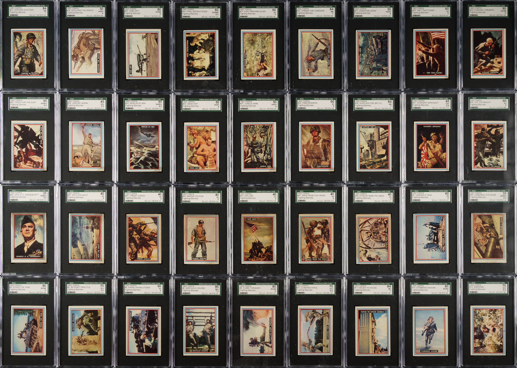 Presented is a sizeable collection of forty-six different 1953 Topps "Fighting Marines" cards (out of 96 in the set) entirely graded and encapsulated by SGC. Missing the following fifty cards for completion: #1, 39, and 49-96. SGC Grading Composite: NM+ 86 (1 card): #8. NM 84 (5 cards): #7, 11, 22, 27, and 38. EX/NM+ 82 (2 cards): #24 and 40. EX/NM 80 (7 cards): #4, 9, 10, 13, 15, 25, and 28. EX+ 70 (4 cards): #2, 5, 12, and 14. EX 60 (7 cards): #3, 6, 19, 23, 29, 30, and 36. VG/EX+ 55 (4 cards): #16, 17, 33, and 35. VG/EX 50 (5 cards): #20, 21, 26, 31, and 32. VG+ 45 (2 cards): #34 and 37. VG 40 (7 cards): #18, 41, 43, 44, 45, 46, and 47. GOOD+ 35 (2 cards): #42 and 48. Total: 46 cards. The size/weight of this item requires that there will be an additional shipping charge for this lot.
