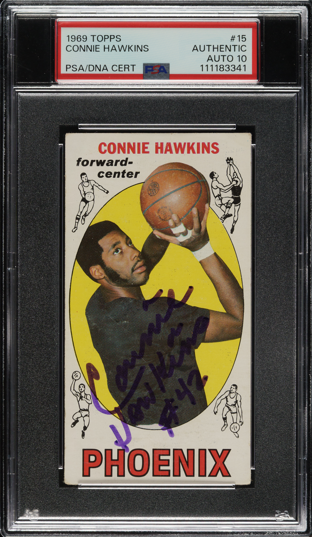 PSA/DNA has encapsulated the card, grading the signature GEM MINT 10. Phoenix Suns basketball Hall of Famer Connie Hawkins.