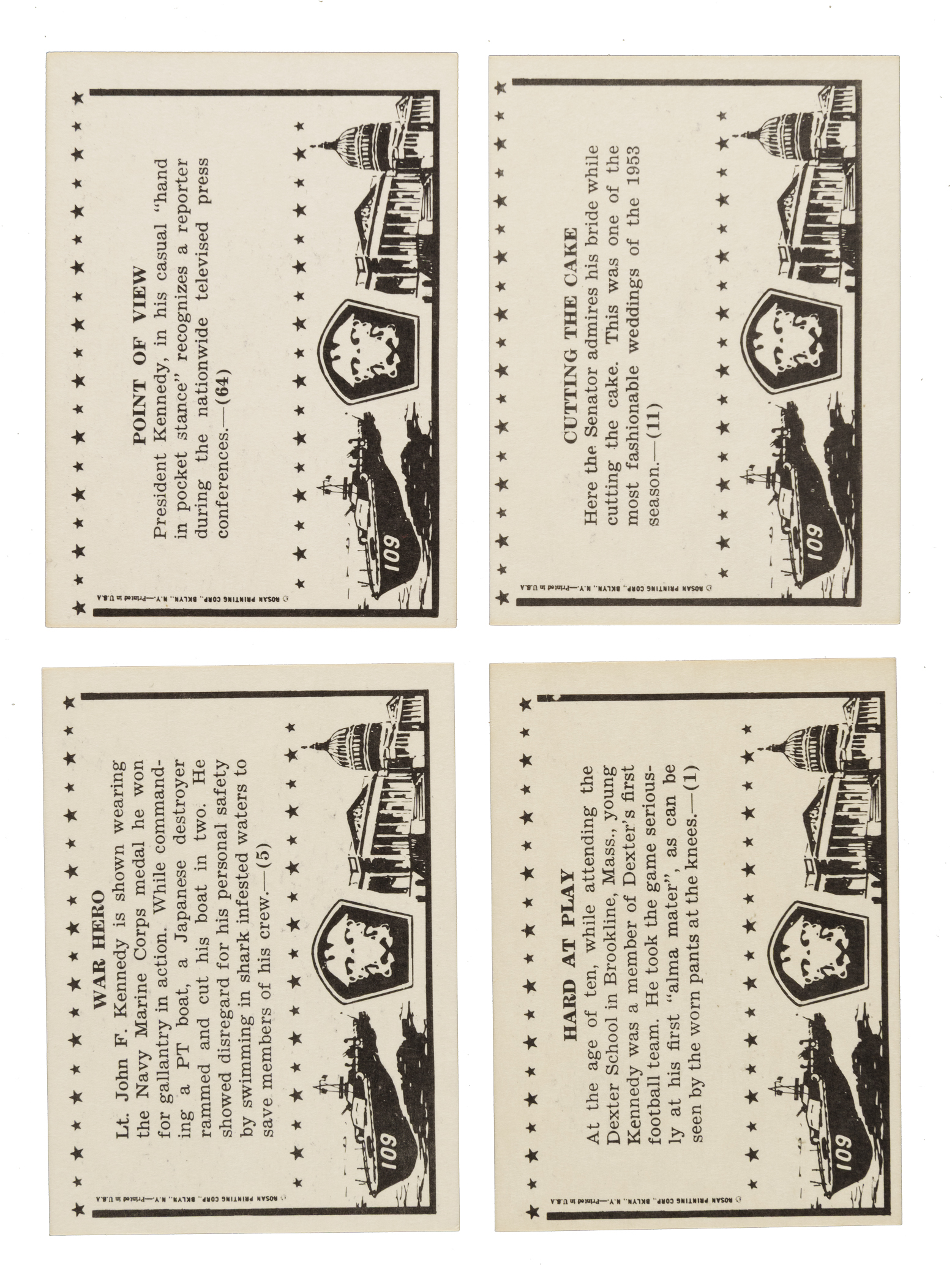 Complete set of 1963 Rosan "John F. Kennedy" trading cards. Condition is 31% Nr/Mt or better, 47% Ex to Ex-Mt, and 22% Vg to Vg-Ex. Total: 64 cards. The size/weight of this item requires that there will be an additional shipping charge for this lot.