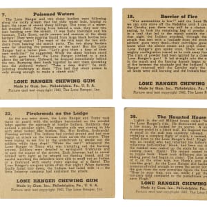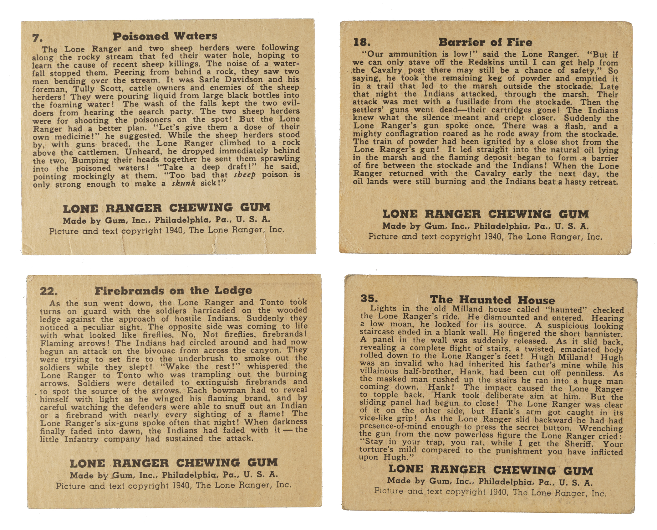 1940 R83 "Lone Ranger" collection of the first 36 cards (#1-36) of the 48 in the set. Gum, Inc.'s 1940 "Lone Ranger" series is one of the most popular nonsport sets ever issued. Its outstanding color, detailed artwork, popular subject matter, and the exciting adventures presented on the backs, all contribute to making this set one of nonsport collecting's all-time classics. Lone Rangers were printed in sheets of twenty-four cards and issued in two separate twenty-four card series. This collection represents a complete set of the low-number series cards. Condition is 16% Vg-Ex or slightly better, 36% Gd to Vg, and 48% Pr to Fr (including two trimmed). This is a very presentable low- to mid-grade collection of this extremely popular and classic nonsport-card issue. Total: 36 cards.
