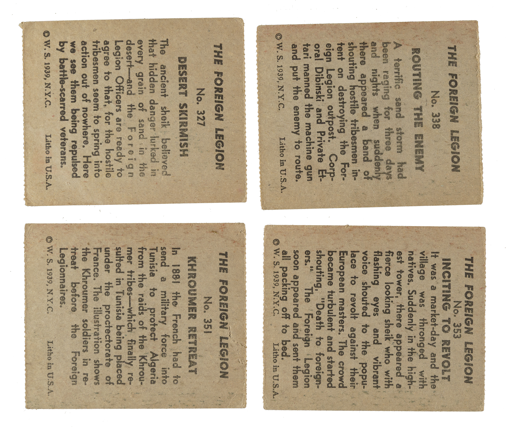 Presented is a near-complete set of 1939 R54 W.S. Corporation "The Foreign Legion" consisting of forty-seven different cards (out of 48 in the set). Missing only #325 (first card in set, numbered 325-372) for completion. Condition is 53% Vg to Vg-Ex (including a couple higher), 28% Gd, and 19% Pr to Fr. Total: 47 cards. The size/weight of this item requires that there will be an additional shipping charge for this lot.