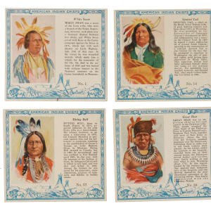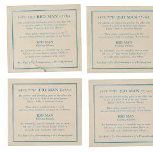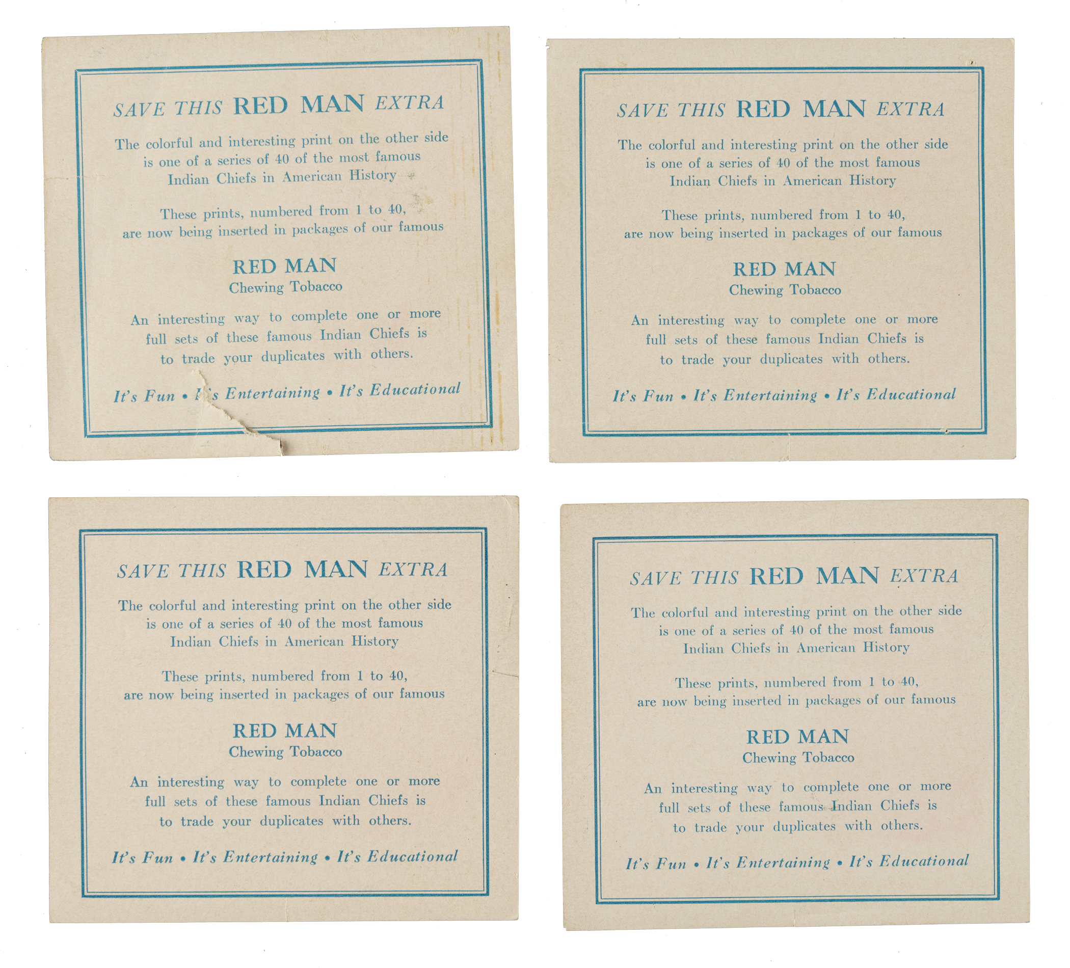 Presented is a complete 40-card set of "American Indian Chiefs" cards issued by the Red Man Tobacco Co. in 1954. This colorful series uses similar artwork that appears on the N2 Allen & Ginter American Indian Chiefs series issued in 1888 and features many of the most legendary American Indian Chiefs. Included are Red Cloud, Sitting Bull, Chief Joseph, and many more. Condition ranges from Pr to Fr (due to small tear at bottom). Total: 40 cards. The size/weight of this item requires that there will be an additional shipping charge for this lot.