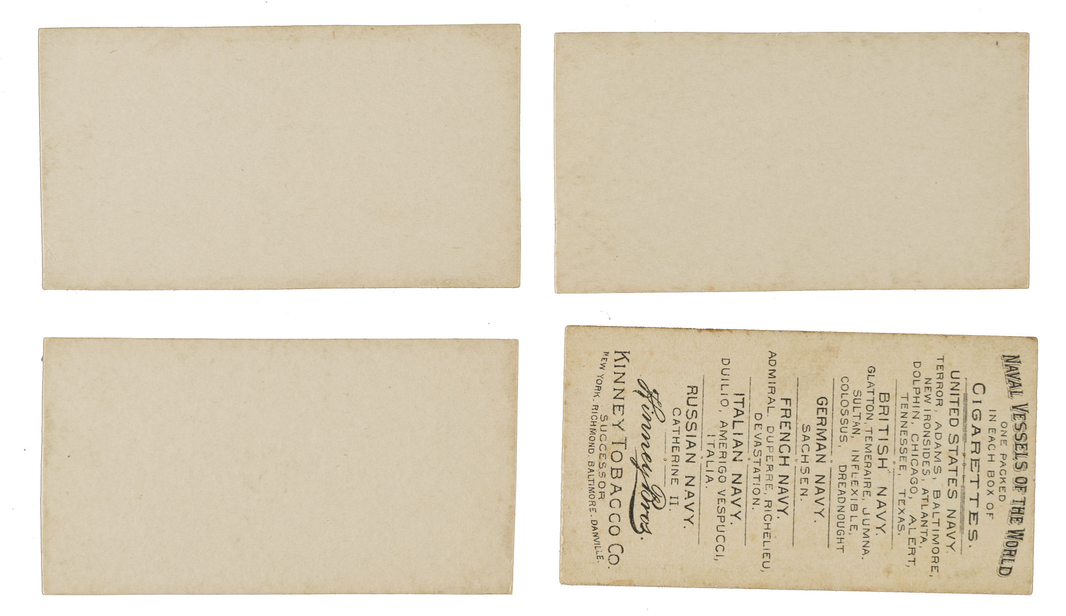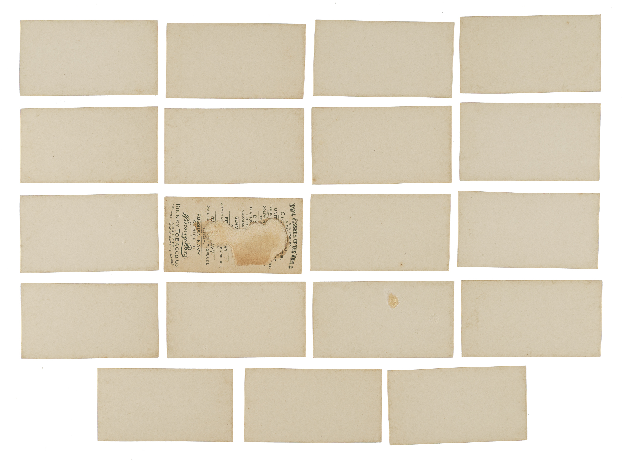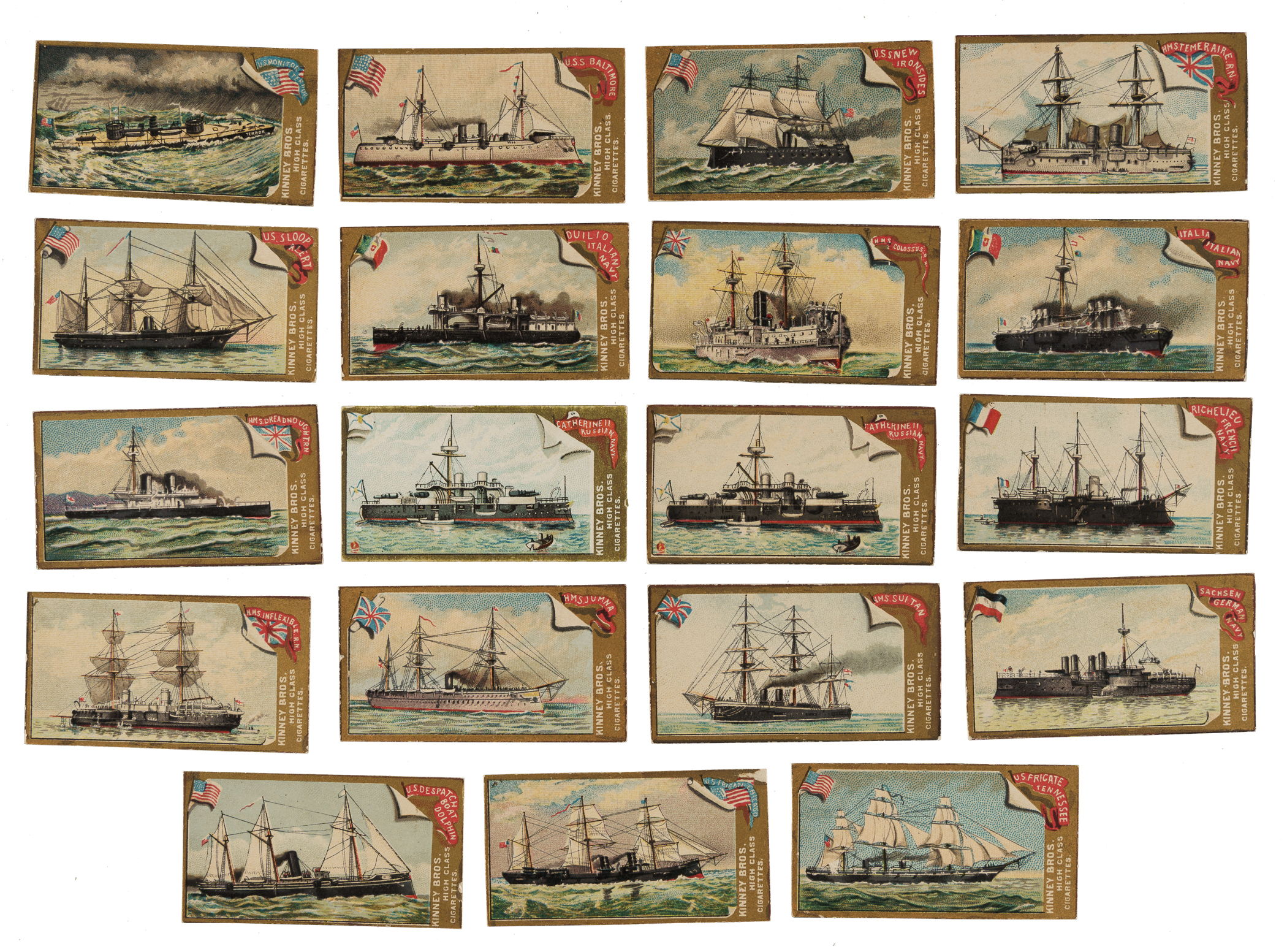 Presented is a near-complete set of 1889 N226 Kinney Bros. "Naval Vessels of the World" consisting of twenty-one different cards, out of 25 in the set. All cards are blank backs and trimmed off an advertising banner except for two duplicates (Catherine II and HMS Inflexible) which have advertisement backs. The following grades are without reference to this characteristic. Missing the following four cards for completion: Amerigo Vespucci, Devastation, USS Texas, and US Sloop of War Adams. Condition ranges from Vg-Ex to Ex-Mt, including a couple lesser. Total: 23 cards. The size/weight of this item requires that there will be an additional shipping charge for this lot.