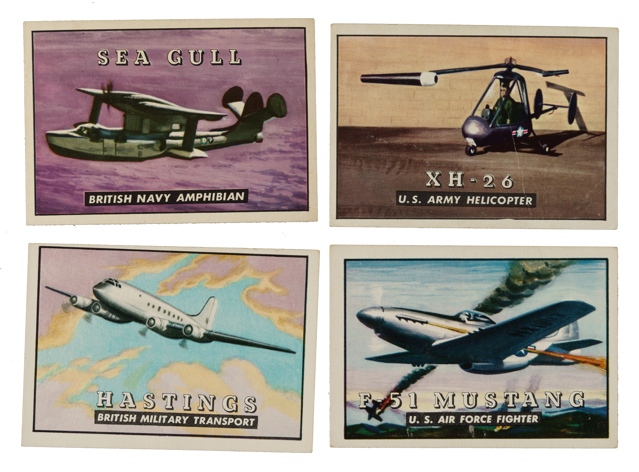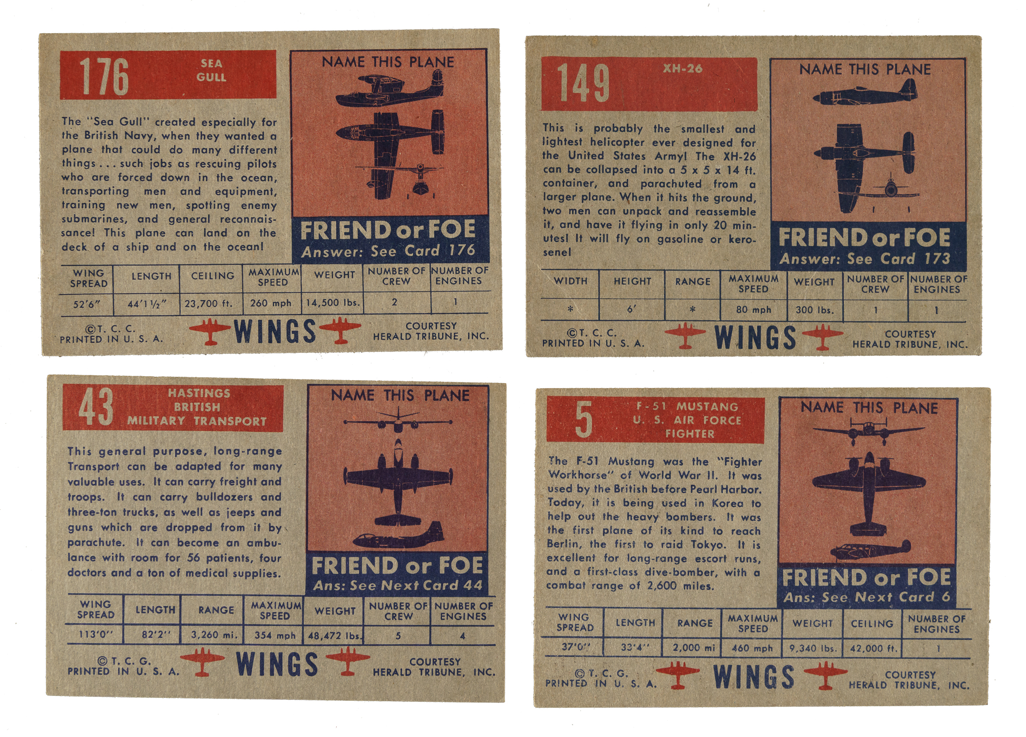Very attractive mid-grade complete set of Topps "Wings" consisting of 200 cards. Condition is 40% Ex to Ex-Mt (mostly Ex), 44% Vg to Vg-Ex, and 16% lesser. This classic nonsport set is a favorite of collectors and features images of various aircraft with descriptions on the reverse. Total: 200 cards. The size/weight of this item requires that there will be an additional shipping charge for this lot.