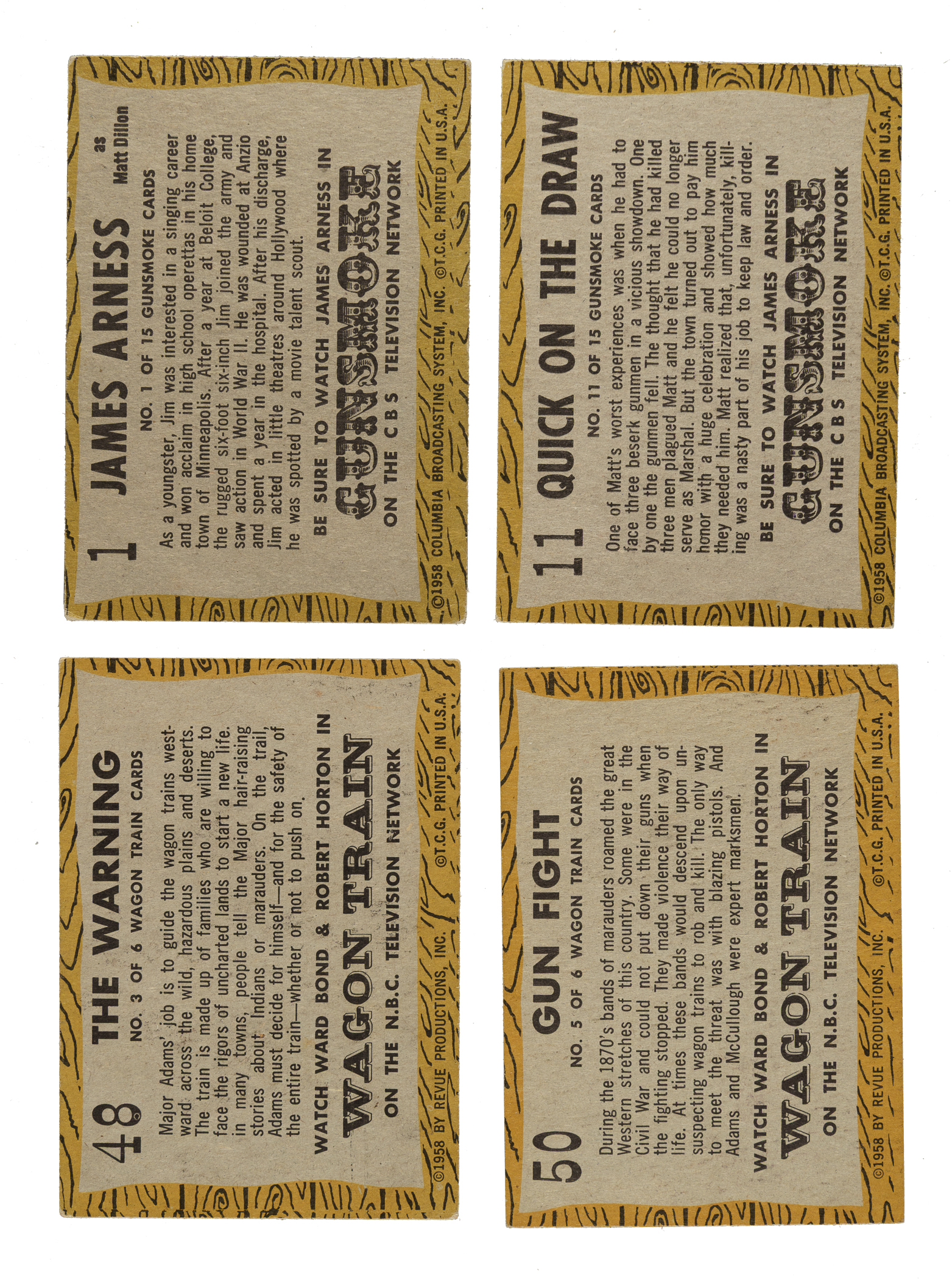 Complete 71-card set of 1958 Topps "TV Westerns" trading cards. Condition is 28% Ex to Ex-Mt and 72% Vg to Vg-Ex (including a few lesser). Total: 71 cards. The size/weight of this item requires that there will be an additional shipping charge for this lot.