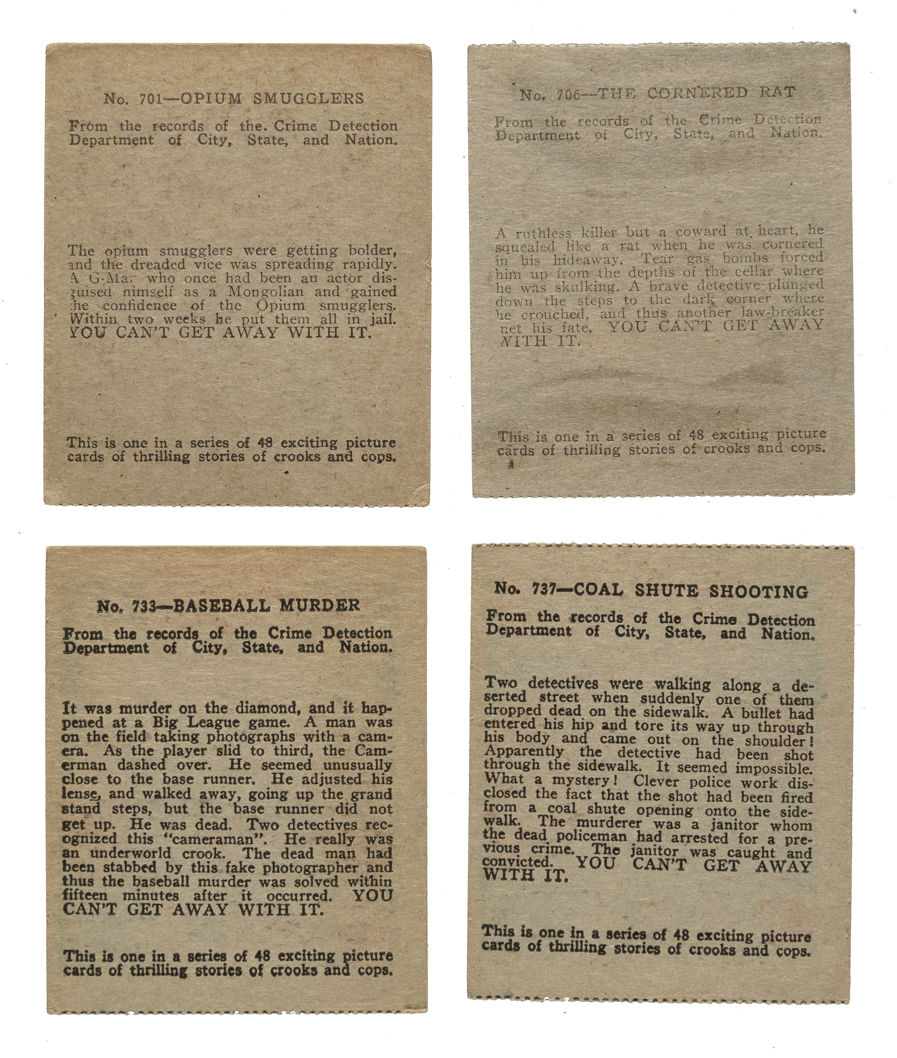 In the 1930s, G-Men had their hands full fighting crime. The many high-profile cases of the era were plastered across the front pages all across America, capturing the imaginations of youngsters and adults alike, and, of course, inspiring several trading-card sets. Offered is a near-complete set of 1936 R13-2 "American G-Men" (second series #701-748 ), missing only #746 for completion. No manufacturer is listed on the cards, but they are very likely produced by M. Pressner & Company (who also produced the similar "Government Agents vs. Public Enemies" series). Condition is 47% Vg to Vg-Ex (including a few Ex), 27% Gd, and 26% Pr to Fr. These nonsport sets dating from the 1930s are often referred to as "strip cards" because these sets were originally issued in uncut perforated strips. Though the 1930s were dominated by traditional bubble-gum cards, quite a few card sets were issued in this format. Most are very similar in design, and were numbered with card numbers beginning with high numbers (such as 101, 201, etc.) as opposed to beginning with number "1." These cards are printed on a relatively inexpensive, porous stock, and are characterized by a somewhat primitive style of illustration. This rarely offered and fascinating near-complete set (minus one) represents this particular style of card production unique to the era. Total: 47 cards.
