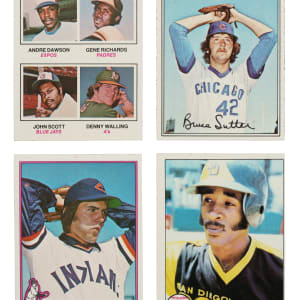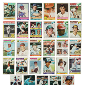 Collection of three complete Topps baseball sets dating from 1976, 1977, and 1979. Each set offers numerous highlights, including key rookie cards of several Hall of Famers, among them Dennis Eckersley, Bruce Sutter, Andre Dawson, and Ozzie Smith. This trio consists of the following: 1) 1976 Topps Complete Set (660) Plus Traded Series (44): Condition is 53% Nr/Mt to Nr/Mt-Mt, 42% Ex to Ex-Mt, and 5% Vg to Vg-Ex. Condition of traded series is 32% Nr/Mt to Nr/Mt-Mt, 54% Ex to Ex-Mt, and 14% Vg to Vg-Ex. Keys: #1 Aaron RB (Nr/Mt), 19 Brett (Nr/Mt), 98 Eckersley RC (80/20 T/B, otherwise Nr/Mt-Mt), 240 Rose (Nr/Mt), 330 Ryan (Ex-Mt+), 345 Ruth ATAS (Nr/Mt-Mt), 480 Schmidt (Nr/Mt), 550 Aaron (slight miscut, otherwise Vg-Ex due to centering), and 599 Guidry RC (Ex). 2) 1977 Topps Complete Set (660): Condition is 30% Nr/Mt to Nr/Mt-Mt, 46% Ex to Ex-Mt (due mostly to centering), and 24% Vg to Vg-Ex (due mostly to centering and including a few lesser). Keys: #10 Jackson (Ex-Mt), 70 Bench (Ex-Mt), 140 Schmidt (Nr/Mt+), 144 Sutter RC (Nr/Mt-Mt), 234 Ryan RB (Nr/Mt+), 265 Fidrych RC (Vg), 355 Brock (Nr/Mt), 450 Rose (Nr/Mt), 473 Dawson RC (Nr/Mt+), 476 Murphy RC (Nr/Mt), 523 Fingers (15/85 T/B, otherwise Nr/Mt), 580 Brett (90/10 T/B, otherwise Nr/Mt-Mt), 600 Palmer (Vg), 635 Yount (5/95 L/R and 90/10 T/B, otherwise Ex-Mt+), and 650 Ryan (99/1 T/B, otherwise Nr/Mt). 3) 1979 Topps Complete Set (726): Condition is 38% Nr/Mt to Nr/Mt-Mt (including a few higher), 42% Ex to Ex-Mt (due mostly to centering), and 20% Vg to Vg-Ex (including a few lesser). Keys: #24 Molitor (Ex-Mt due to centering), 115 Ryan (Ex+), 116 Smith RC (90/10 L/R, otherwise Ex-Mt), 200 Bench (Nr/Mt), 300 Carew (Nr/Mt), Brett 330 (Ex), 640 Murray (Nr/Mt), 650 Rose (80/20 T/B, otherwise Nr/Mt-Mt), and 700 Jackson (Ex+). This is an outstanding collection of cards from these popular 1970s sets. Total: 3 sets, 2,090 cards. The size/weight of this item requires that there will be an additional shipping charge for this lot.