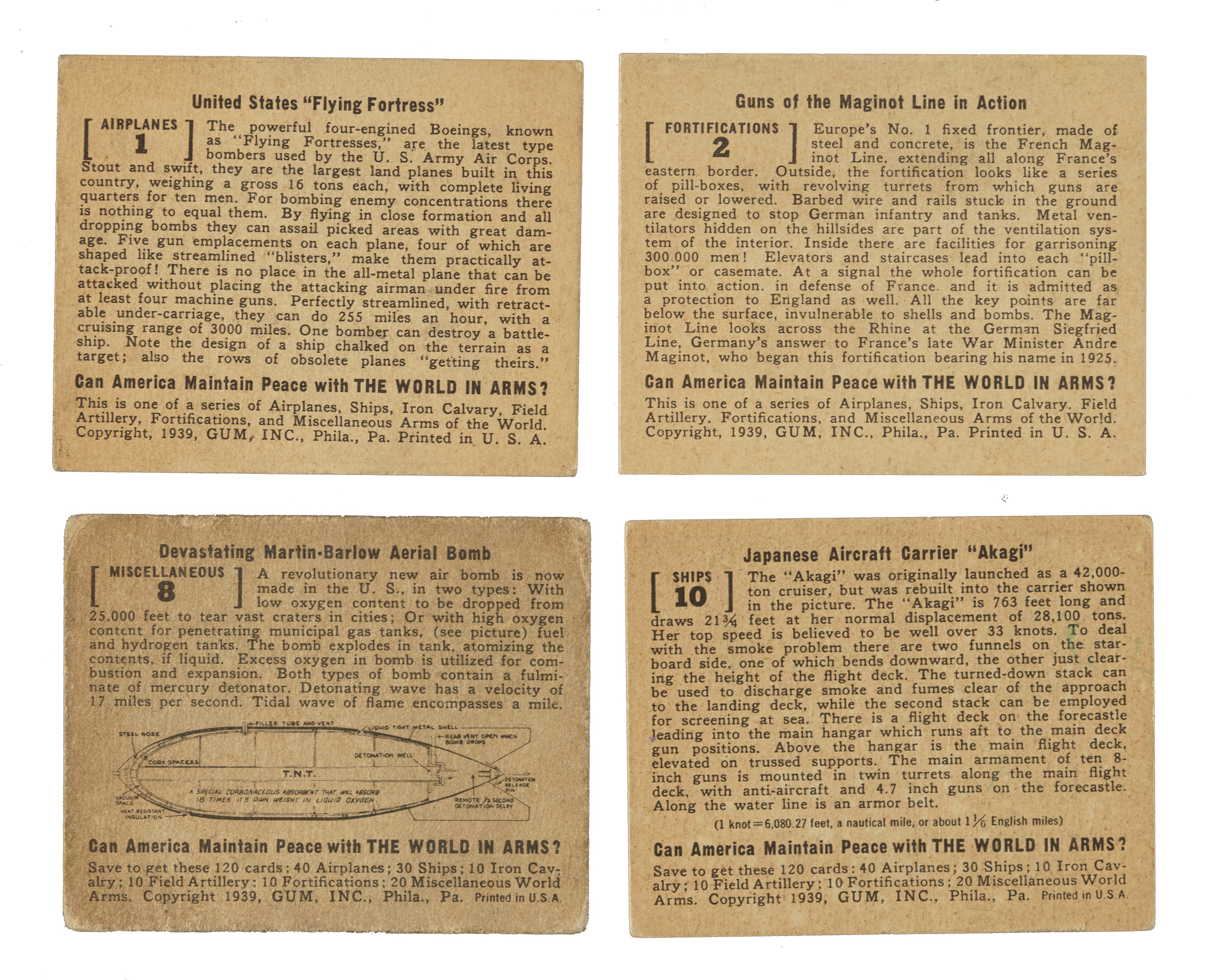 Presented is a pair of complete 48-card sets of R173 Gum Inc. "The World in Arms" cards, which feature some of the finest artwork of any Gum, Inc., production. The set is organized into six separate series, each with a different theme relating to the arms of the world: "Airplanes," "Ships," "Iron Calvary," "Field Artillery," "Fortifications," and "Miscellaneous." Created in the same era as the gruesome "Horrors of War" issue, the R173 World in Arms series focuses on the weapons used by countries involved in the war efforts. Includes one duplicate (#M-2). The condition is 17% Vg-Ex or slightly better, 67% Gd to Vg, and 16% lesser). This is an attractive and mostly mid-grade offering of two complete sets of this popular nonsport issue. Total: 97 cards (two 48-card sets and one duplicate).
