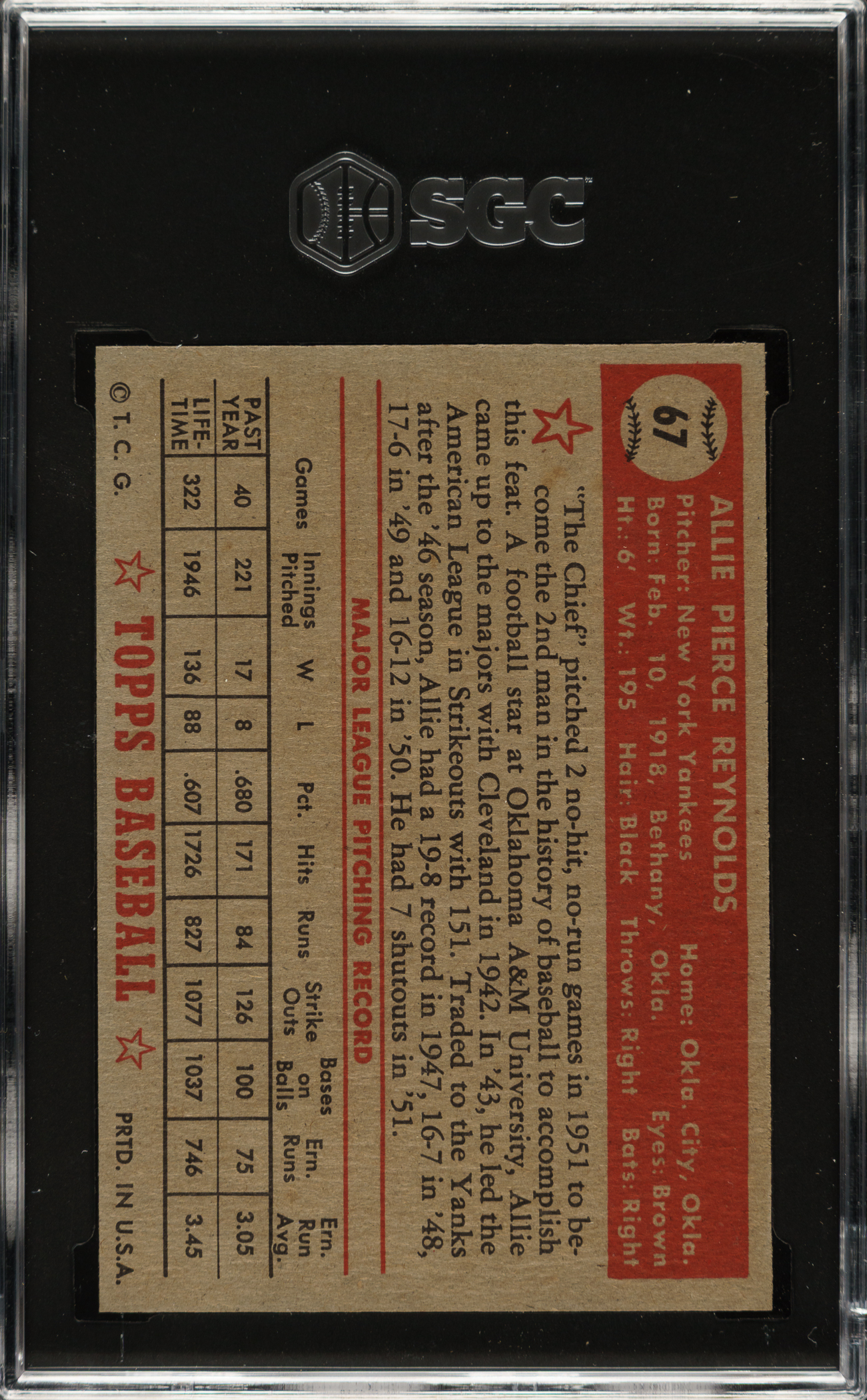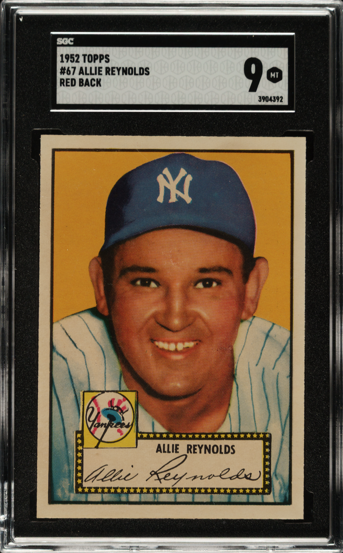 Graded MINT 9 by SGC. This is the ONLY example graded at this level by SGC with none higher! Stunning example of New York Yankees pitcher Allie Reynolds (#67) from the legendary 1952 Topps set. Exceptionally crisp and clean, with bold colors, and sharp corners. Clean reverse. To date, SGC has graded nearly 53,000 cards from the 1952 Topps set, and less than one percent have ever graded MINT or better! This card would make an ideal addition to any world-class 1952 Topps set or New York Yankees card collection.